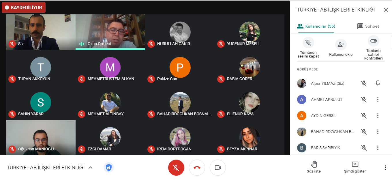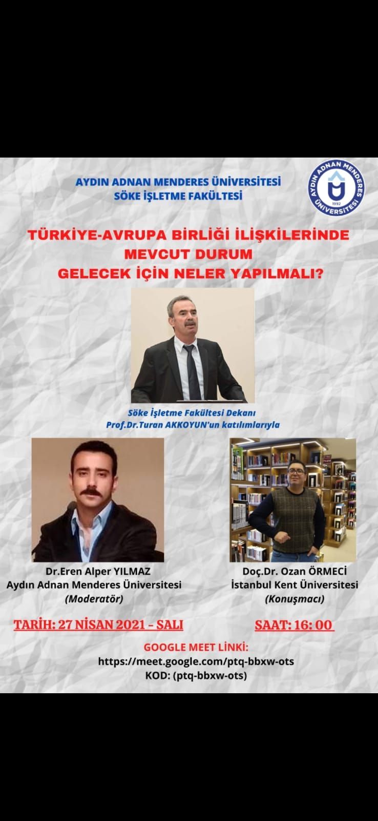 27 Nisan 2021 Salı günü saat 16.00’da Google Meet üzerinden Aydın Adnan Menderes Üniversitesi Söke İşletme Fakültesi bünyesinde “Türkiye-Avrupa Birliği İlişkilerinde Mevcut Durum: Gelecek İçin Neler Yapılmalı?” başlıklı söyleşi düzenlendi. Söke İşletme Fakültesi Dekanı Prof.Dr. Turan Akkoyun’un da katılımlarıyla gerçekleşen söyleşide İstanbul Kent Üniversitesi Siyaset Bilimi ve Kamu Yönetimi öğretim üyesi Doç.Dr. Ozan Örmeci, Türkiye-AB ilişkilerini tarihsel perspektiften günümüze kadar değerlendirerek, konu hakkında merak edilen soruları cevapladı. Moderatörlüğünü Söke İşletme Fakültesi Kamu Yönetimi Bölümü’nden Dr. Eren Alper Yılmaz’ın yaptığı söyleşiye, Söke İşletme Fakültesi’nden Dr. Öğr.Üyesi Pınar Zarif Tapkan, Dr. Öğr. Üyesi Alper Yılmaz, Dr. Öğr. Üyesi Aydın Gersil, Araş.Gör. Ahmet Akbulut ve İstanbul Kent Üniversitesi öğretim üyelerinin yanı sıra, üniversitesi içinden ve dışından öğrenciler yoğun bir ilgi ve katılım gösterdiler.