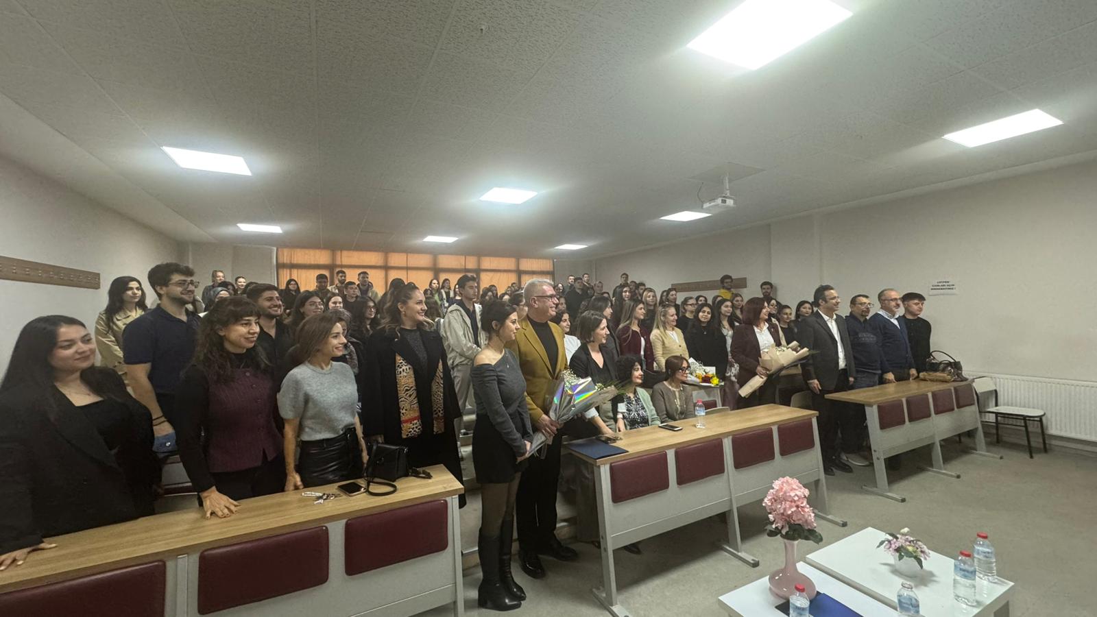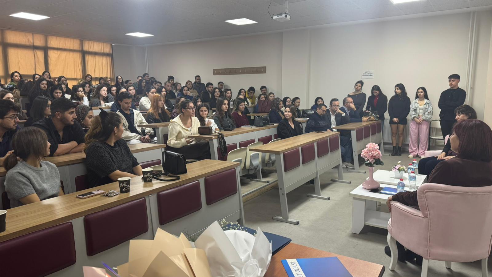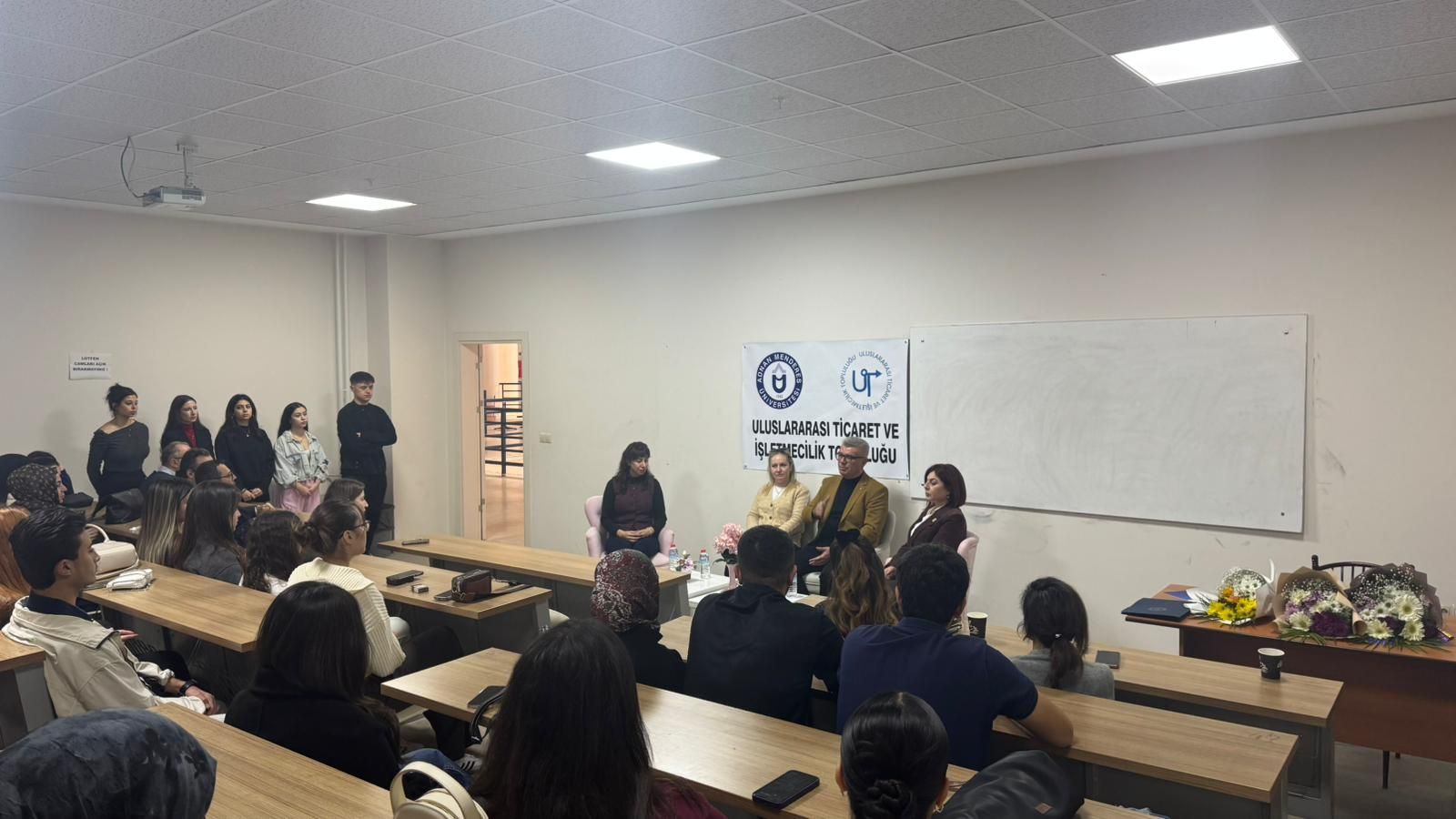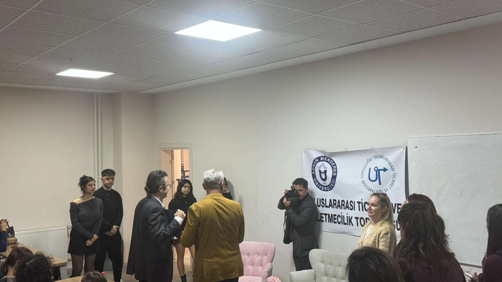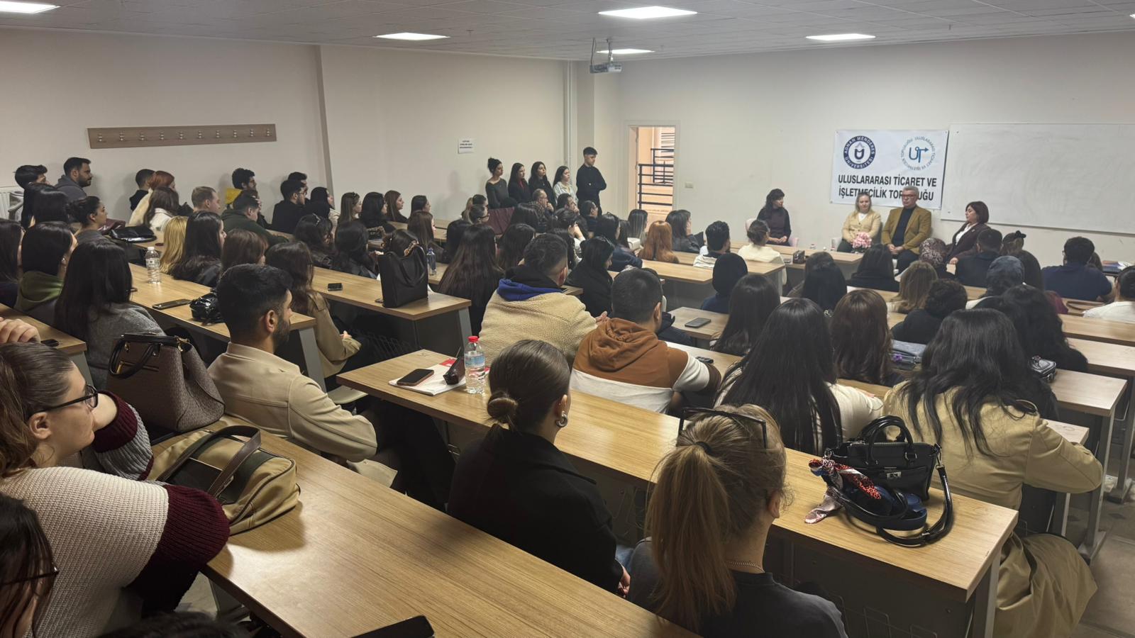 Fakültemiz Uluslararası Ticaret ve İşletmecilik Topluluğu tarafından 2 Aralık 2025 Salı günü saat 14.30'da yoğun ilgi nedeniyle Konferans Salonu dolunca C blok 105 nolu amfide düzenlenen söyleşi programına Söke Ticaret Odası Yönetim Kurulu Başkanı Metin SAKALAR, Yönetim Kurulu Üyesi Esma CEYLAN ve Meclis Üyesi Feride FİDAN katıldılar. Öğrencilerin ve öğretim üyelerinin yoğun ilgi gösterdiği etkinlikte akademi ve iş dünyasının bir araya gelmesi vesilesiyle uluslararası ticaret, küresel piyasalardaki güncel gelişmeler, girişimcilik, dış ticarette karşılaşılan zorluklar ve çözüm yolları üzerine önemli paylaşımlarda bulunuldu. Topluluk danışmanı Arş. Gör. Dr. Hatice CAN moderatürlüğünde öğrencilerin gelecekteki olası iş hayatlarına ve imkânlarına yönelik sorularına samimiyetle cevap ve ilham veren Sayın Metin SAKALAR, Sayın Esma CEYLAN ve Sayın Feride FİDAN iş dünyasındaki deneyimlerini, kariyer yolculuklarını ve sektör tecrübelerini öğrencilerimizle paylaştılar. Etkinliğe katılım gösteren Ulusararası Ticaret ve İşletmecilik bölümü öğretim üyeleri Prof. Dr. Emre CENGİZ, Prof. Dr. Fisun YÜKSEL, Doç. Dr. Birgül CAMBAZOĞLU, Doç. Dr. Aydın GERSİL, Doç. Dr. Zeliha Can ERGÜN ve Dr. Öğr. Üye. Cebrail MEYDAN'a, Ekonomi bölümü öğretim üyesi Dr. Öğr. Üye. Hatice ARMUTCUOĞLU TEKİN'e ve yoğun ilgi gösteren öğrencilerimize teşekkür ederiz. Etkinlikte Fakültemiz Topluluğunu ve öğrencilerimizi Dekan Yardımcıları Doç. Dr. Beyza ERER ve Dr. Öğr. Üye. Özgür BALMUMCU da yalnız bırakmadılar. Etkinlik, katkı ve katılımlarından dolayı konuklarımıza çiçek takdimi ve teşekkür beratlarının sunumuyla sona erdi.
