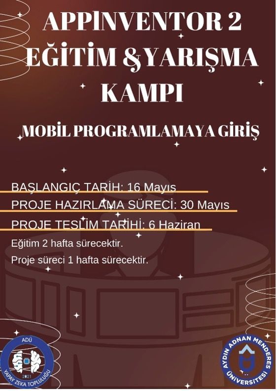 Aydın Adnan Menderes Üniversitesi, Söke İşletme Fakültesi, Yapay Zeka TopluluÄŸu, mobil programlamanın temellerini atmayı ve üretkenliÄŸi artırmayı hedefleyen AppInventor2 kampı düzenlemiÅŸtir. Gün geçtikçe artan bir ilgiyle takip edilen AppInventor, mobil programlamaya yeni baÅŸlayanlar için kolaylıkla Android uygulama geliÅŸtirilebilmesine olanak saÄŸlamaktadır. Topluluk bu özellikleri göz önüne alarak baÅŸlattıkları AppInventor kampı ile kodlamanın temellerini ve algoritma mantığını üyelerine benimsetmeyi amaçlamış, kampa katılan öÄŸrenciler teÅŸvik edilerek proje geliÅŸtirilmesi saÄŸlanmıştır. Kampa katılan öÄŸrenciler yerel veri tabanında veri tutma ve eÅŸ zamanlı olarak, oluÅŸturulan yapıyı idame ettirebilmeye dayanan bir oyun geliÅŸtirmiÅŸlerdir. Ayrıca bulut veri tabanı üzerinde veri tutma, veri çekme, veri yazma ve veri sorgulama çalışmaları gerçekleÅŸtirilmiÅŸtir.