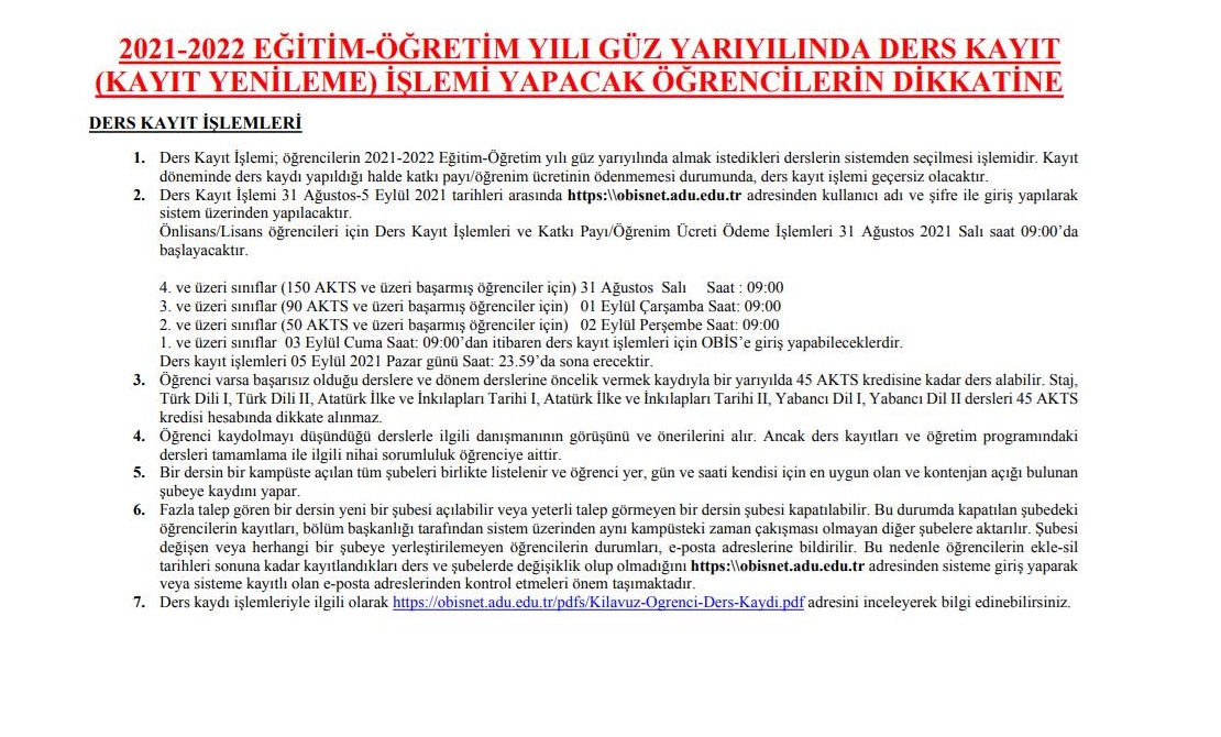 2021-2022 EĞİTİM-ÖĞRETİM YILI GÜZ YARIYILINDA DERS KAYIT (KAYIT YENİLEME) İŞLEMİ YAPACAK ÖĞRENCİLERİN DİKKATİNE