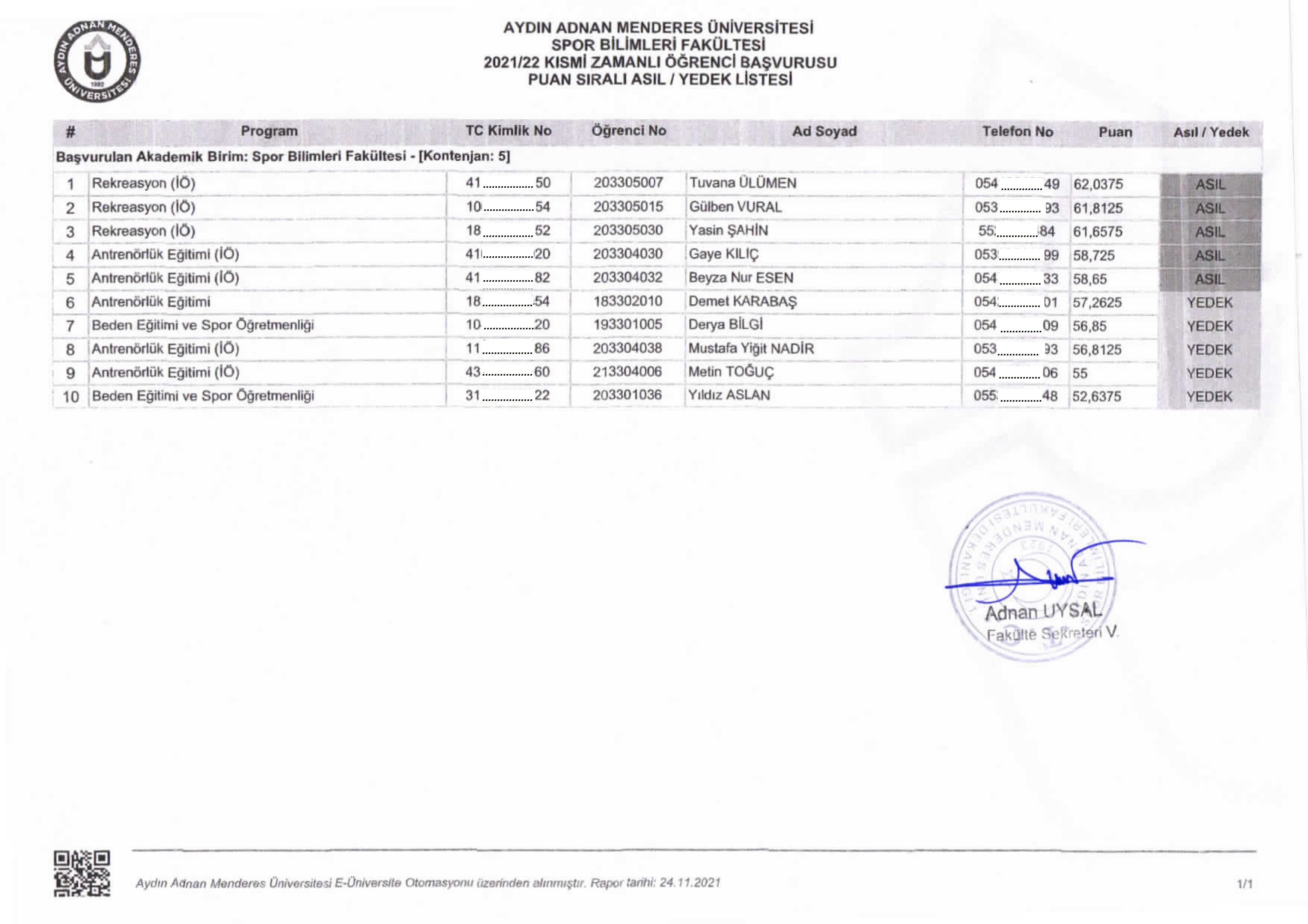 2021/2022 KISMİ ZAMANLI ÖĞRENCİ BAŞVURUSU PUAN SIRALI ASİL / YEDEK LİSTESİ