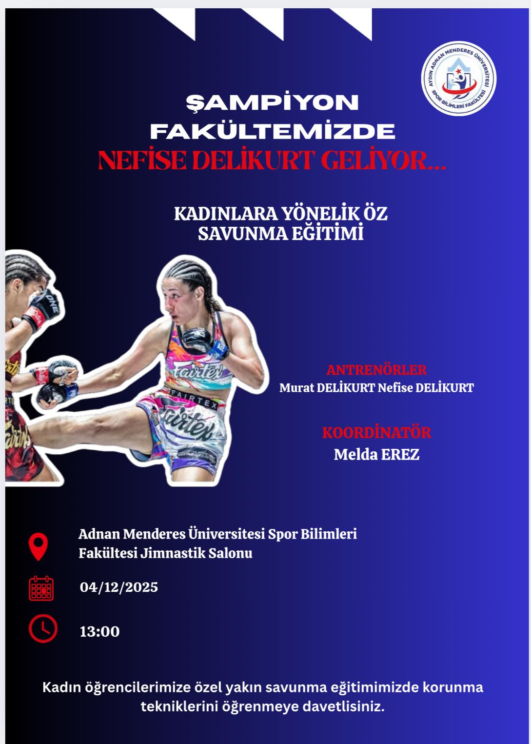 Fakültemiz, kadın öğrencilere yönelik düzenlenen kendini savunma eğitimi kapsamında Dünya Şampiyonu Nefise Delikurt’u ağırlıyor.
