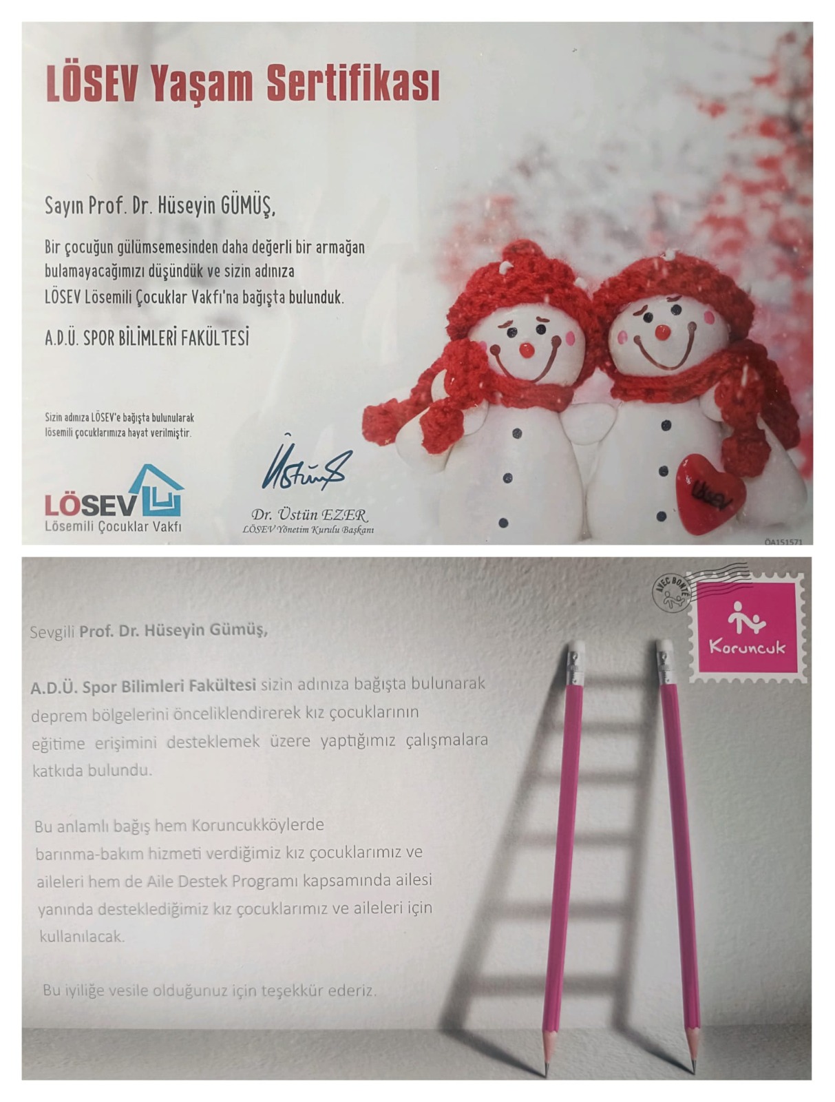 Etkinlik kapsamında, yoğun programına rağmen seminere katılarak bilgi ve deneyimlerini paylaşan konuşmacıya teşekkür etmek amacıyla ADÜ Spor Bilimleri Fakültesi öğrencileri tarafından LÖSEV ve Koruncuk Vakfı adına bağışta bulunuldu. Bağış sertifikaları Prof. Dr. Hüseyin Gümüş ile paylaşıldı.