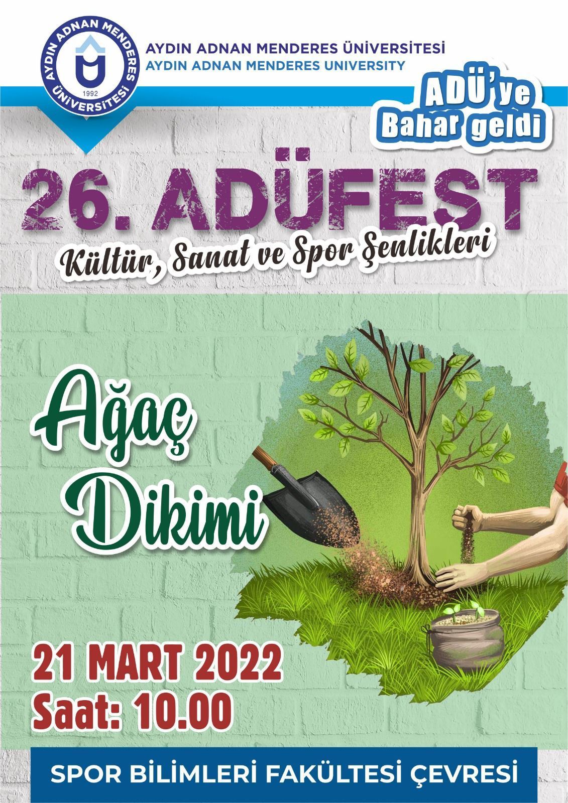 26. ADÜFEST Kültür, Sanat ve Spor Şenlikleri kapsamında 21 Mart Saat: 10.00'da Spor Bilimleri Fakültesi çevresinde ağaç dikimi gerçekleştirilecektir. Spor Bilimleri Fakültesi tarafından organize edilen bu etkinliğe tüm üniversite öğrencileri davetlidir.