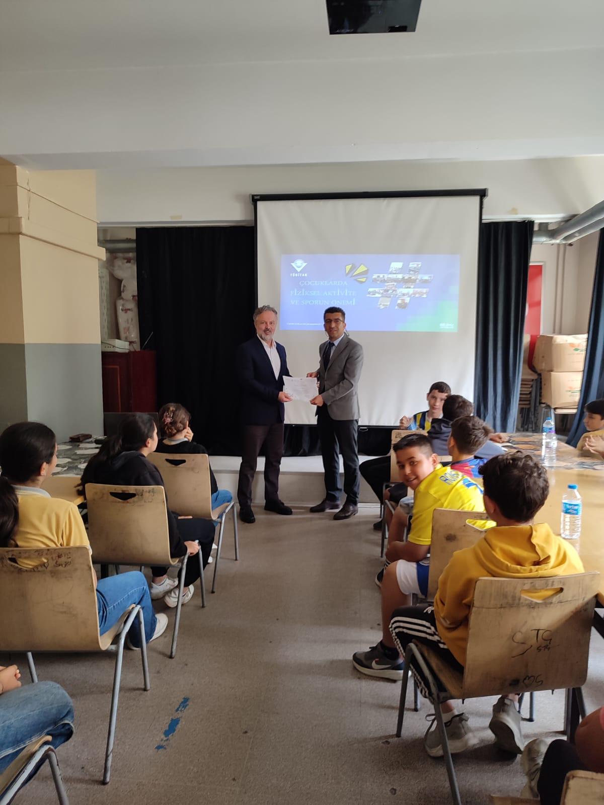 Fakültemiz Dekanı Prof. Dr. SavaÅŸ Duman, TÜBİTAK Bilim SöyleÅŸileri Projesi kapsamında, 75. Yıl Vali Muharrem GöktayoÄŸlu Ortaokulu’nda "Çocuklarda Fiziksel Aktivite ve Sporun Önemi" baÅŸlıklı bir söyleÅŸi gerçekleÅŸtirdi. SöyleÅŸiye, okulun öÄŸrencileri büyük ilgi gösterdi.