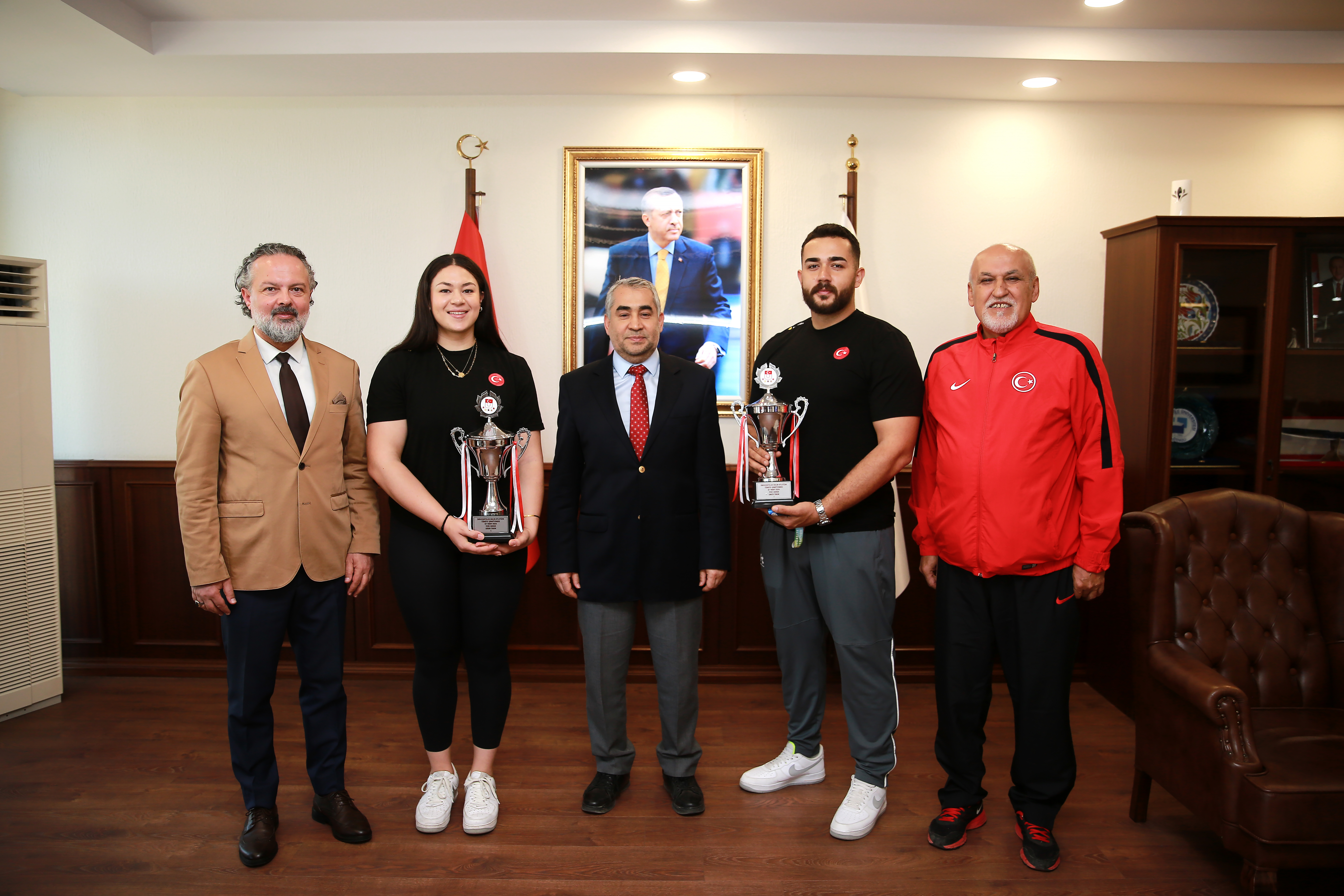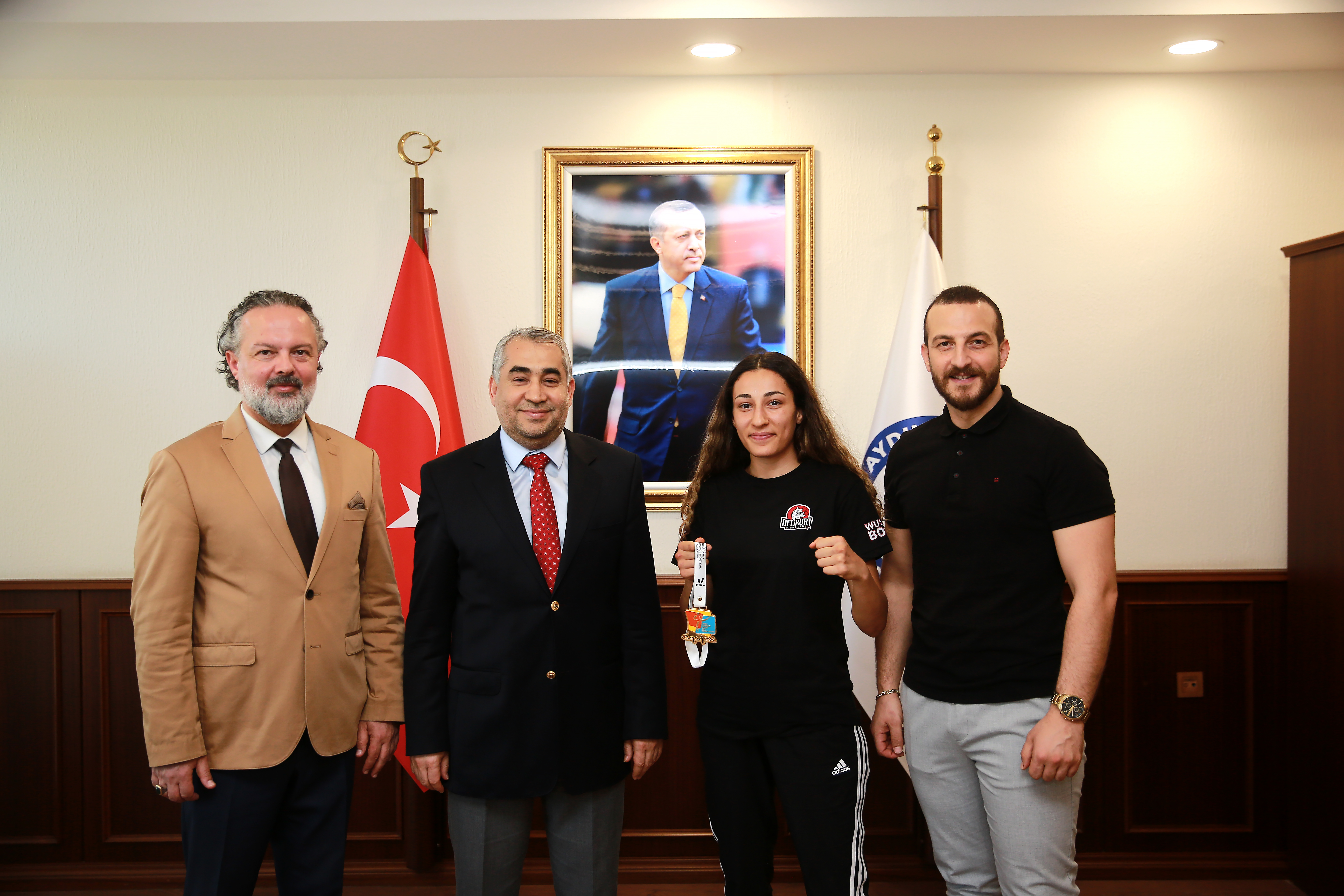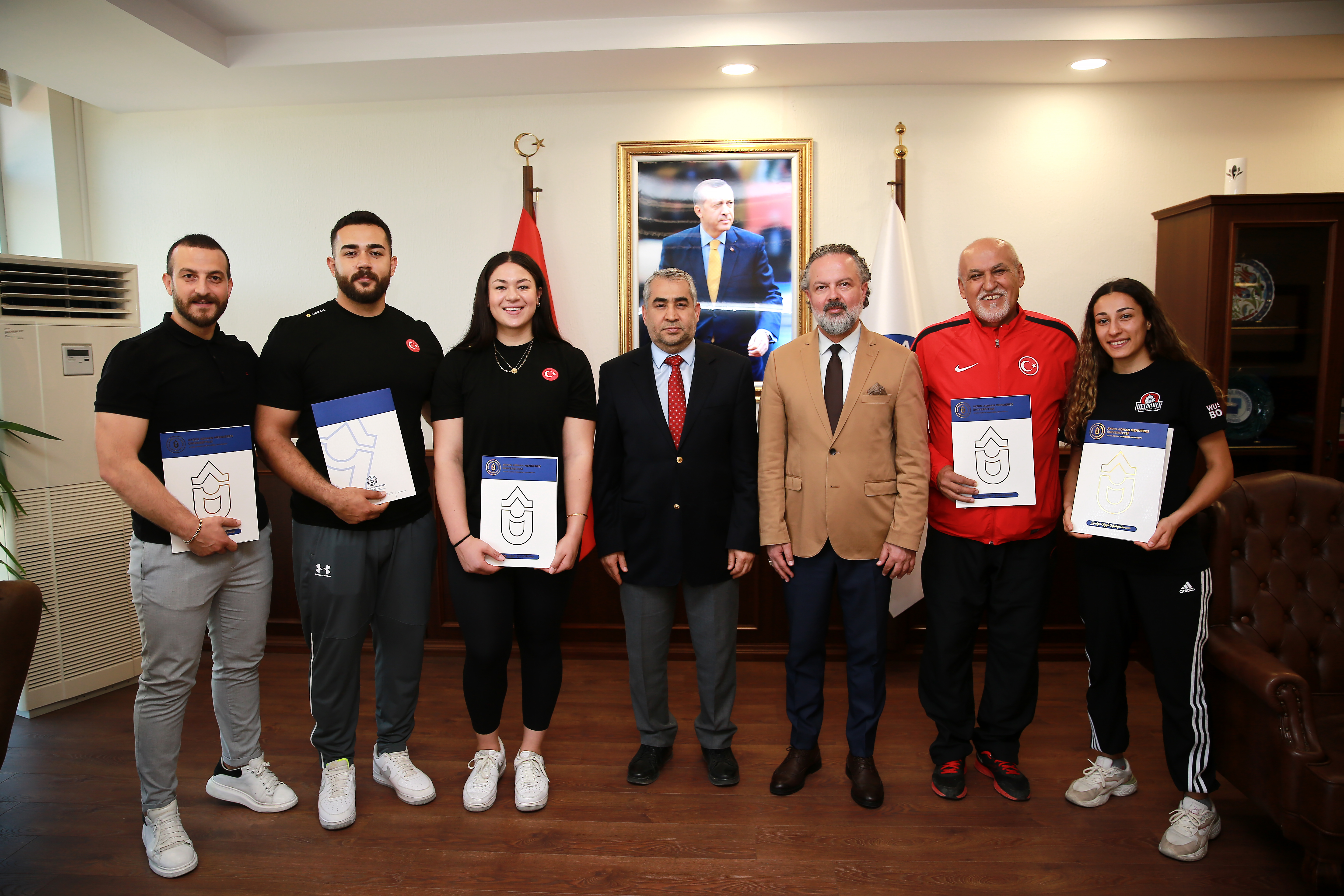 Fakültemiz Dekan V. Prof. Dr. Savaş Duman ve Antrenörlük Eğitimi Bölümü Öğr. Üyesi Doç. Dr. Ali Güreş ile Spor Bilimleri Fakültesi Spor Yöneticiliği Bölümü Arş. Gör. Dr. Ünsal Altınışık’ın da yer aldığı ziyarette, Şampiyonlar Okulu olarak bilinen Spor Bilimleri Fakültesinin gururumuz olmaya devam ettiğini vurgulayan Üniversitemiz Rektörü Prof. Dr. Bülent Kent, “Sürekli gelişen Üniversitemizde geleceği inşa ettiğimiz kıymetli öğrencilerimiz ve arkamızdaki büyük eğitim ordusu ile durmadan, yorulmadan çalışmaya devam ediyoruz. Öğrencilerimiz hem Üniversitemize hem de Aydın’a büyük bir gurur yaşatmıştır. Başta kıymetli evlatlarımız olmak üzere; bu başarıda emeği geçen tüm hocalarımıza teşekkür ediyorum.” dedi.