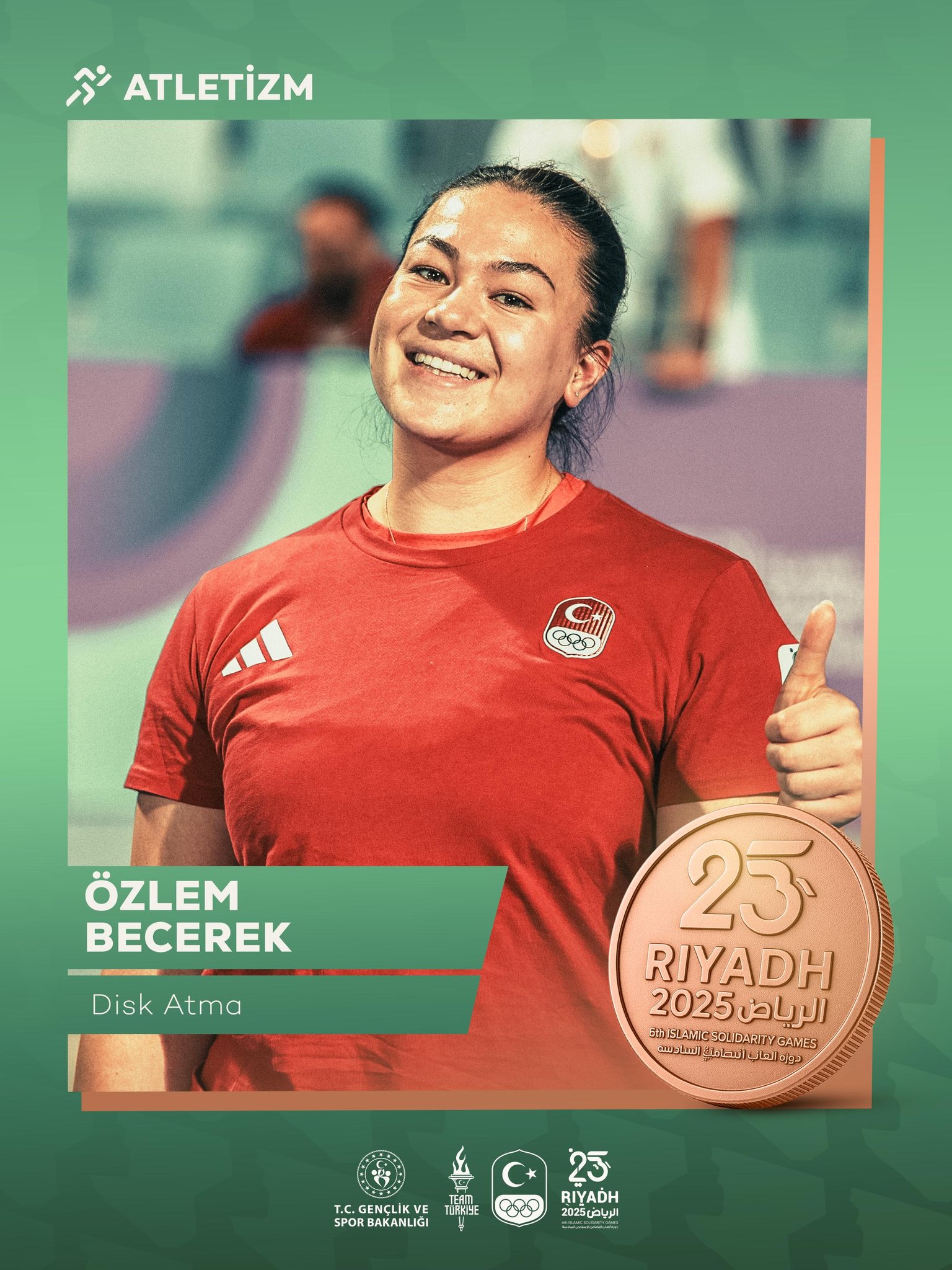 Atletizm kadınlar disk atma branşında ülkemizi temsil eden Özlem Becerek, 55.56 metrelik atışıyla bronz madalya kazandı.