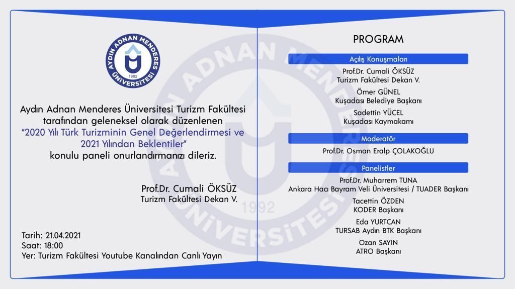Fakültemiz tarafından her yıl geleneksel olarak Turizm Haftası etkinlikleri kapsamında düzenlenen "2020 Yılı Türk Turizminin Genel Değerlendirmesi ve 2021 Yılından Beklentiler" konulu panelimiz 21 Nisan 2021 Çarşamba günü gerçekleştirildi.