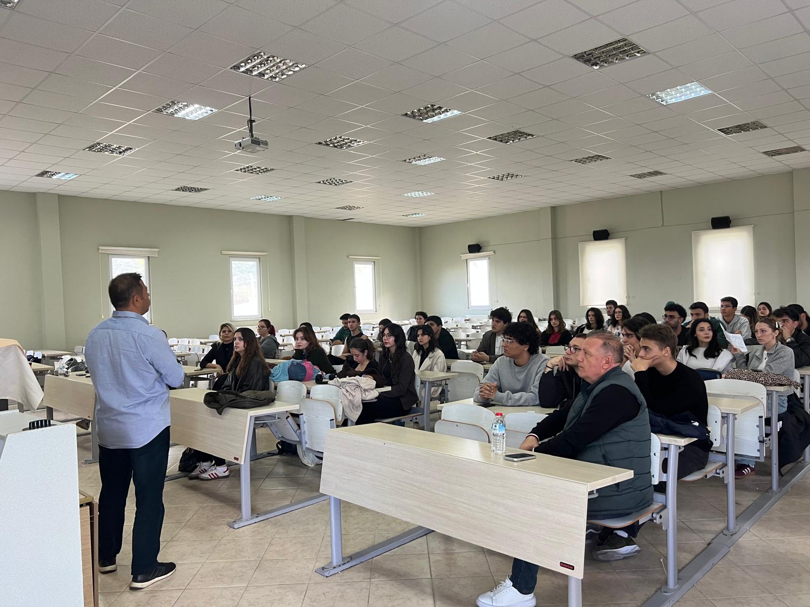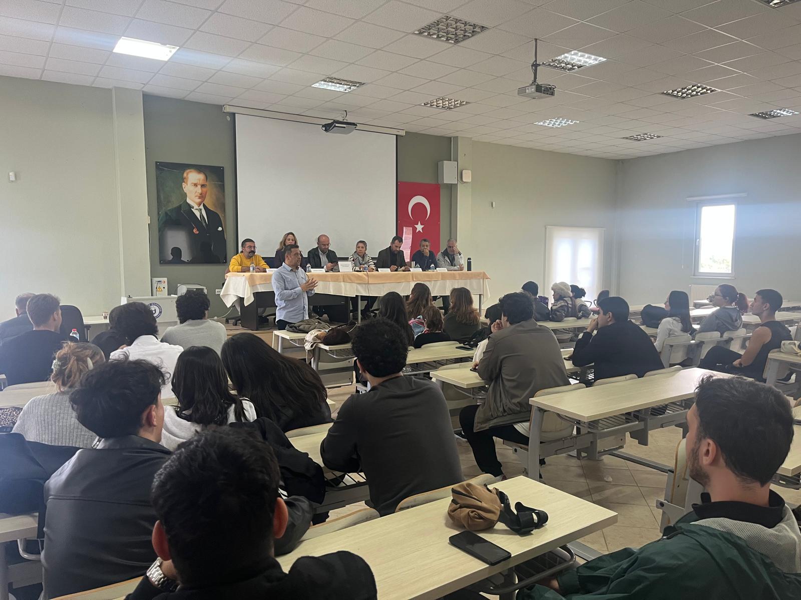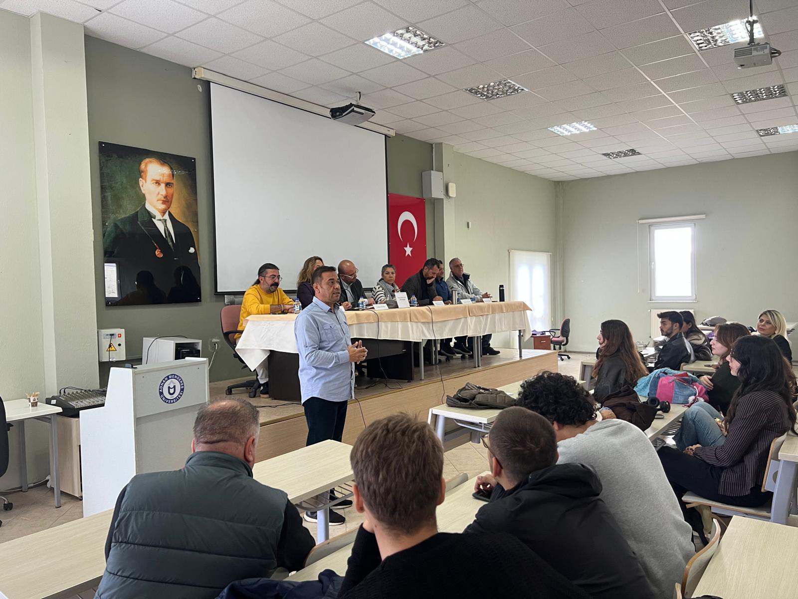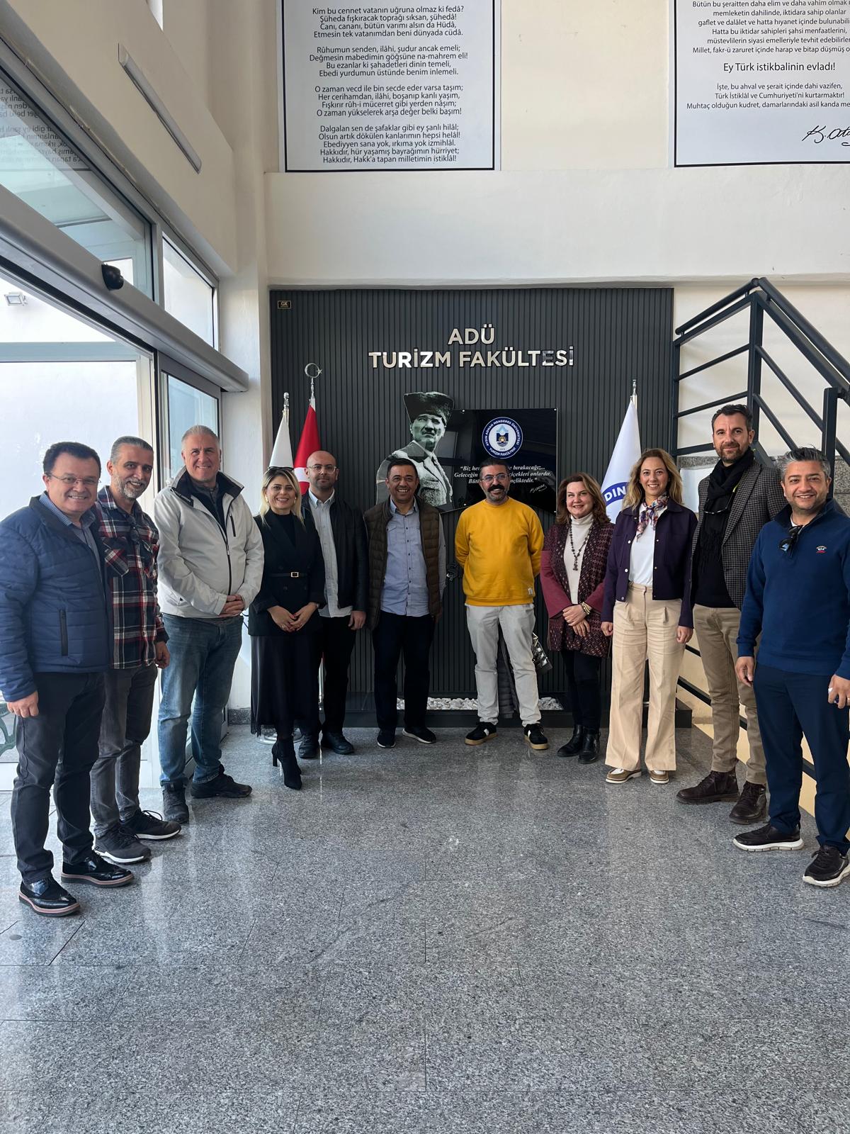 27 Kasım 2025 Perşembe günü Aydın Adnan Menderes Üniversitesi Kuşadası Turizm Fakültesi Konferans Salonunda ATRO Yönetim Kurulu Başkanı Ozan GÜNDÜZALP, Başkan Yardımcısı Rabia ÖZNALBANT, Yönetim Kurulu Üyeleri Gökhan GÜNAYDIN, Umut KURT, Neslihan HURDA ve Volkan AKALIN, Kerem ÖZBAŞ katılımları ile 1. Sınıf Turizm Rehberliği Öğrencileri ile söyleşi düzenlenmiştir. Turist rehberliği ve süreçlerin işleyişi ile ilgili konular hakkında bilgi verilerek, mesleğe dair değerlendirmeler yapılmıştır. Soru ve cevap şeklinde devam eden toplantı gelecekteki eğitimler ve işbirliği konularının belirlenmesi kararı ile son bulmuştur. Paydaşımız olarak her zaman öğrencilerimizin yanında olan ATRO ve Yönetim Kuruluna ziyaretleri için teşekkür ederiz.
