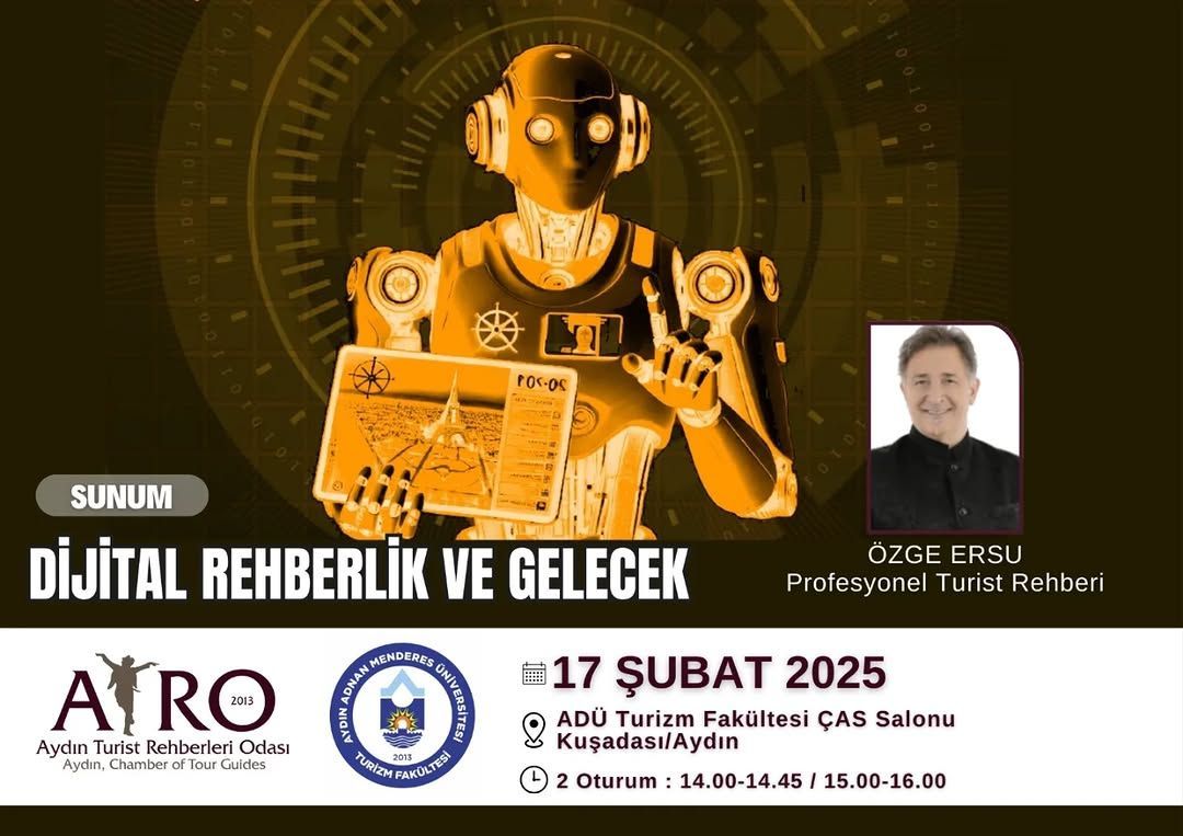 Aydın Turist Rehberleri Odası (ATRO) ve ADÜ Turizm Fakültesi iş birliğiyle düzenlenen etkinlik, Turizm Fakültesinde gerçekleşti. Sunumda, dijitalleşmenin turizm rehberliği üzerindeki etkileri, yapay zeka destekli rehberlik uygulamaları ve gelecekte turist rehberlerinin nasıl bir dönüşüm geçireceği gibi konular ele alındı.