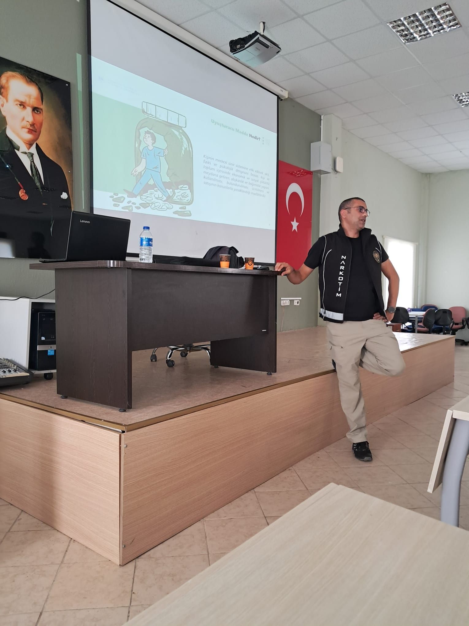 Narko Gençlik Programı kapsamında, Kuşadası Narkotik Suçlarla Mücadele Büro Amirliği’nden Polis Memuru Muhammed Mustafa GÖÇEBE, öğrencilerimize yönelik son derece yararlı, eğitici ve bilgilendirici bir sunum gerçekleştirmiştir.