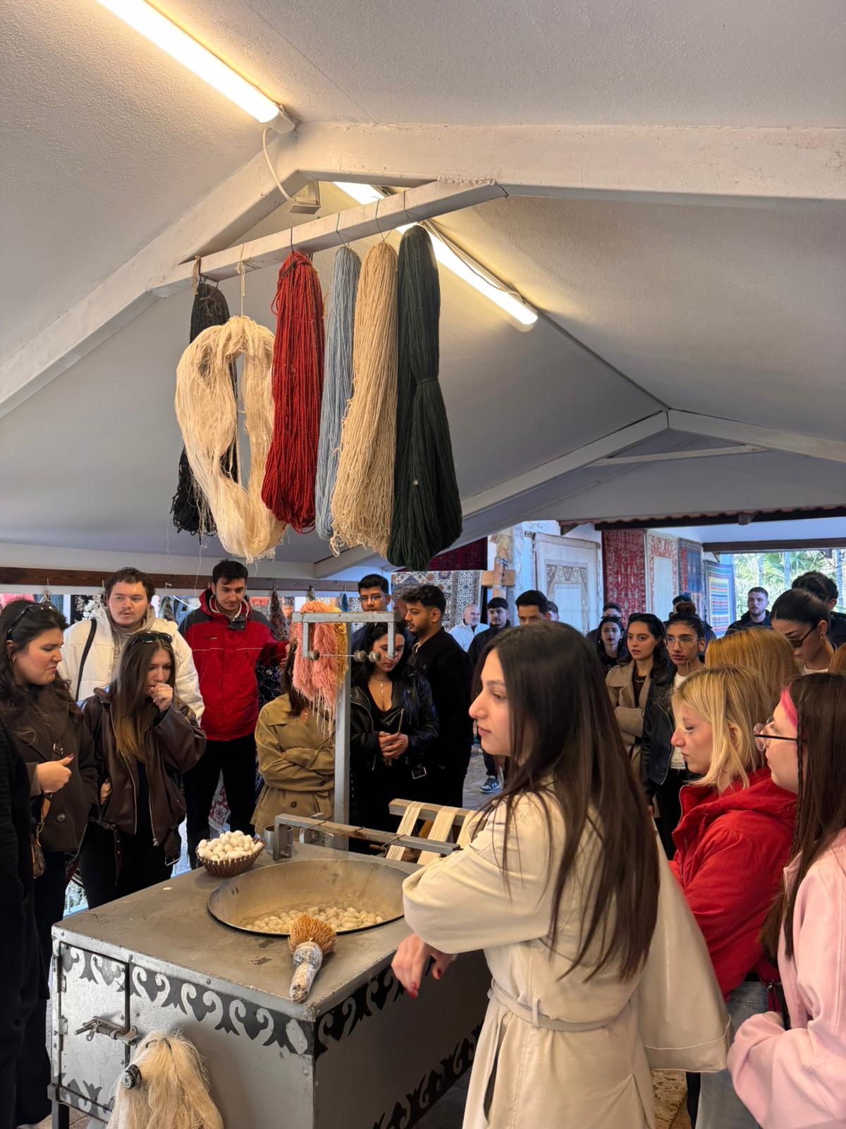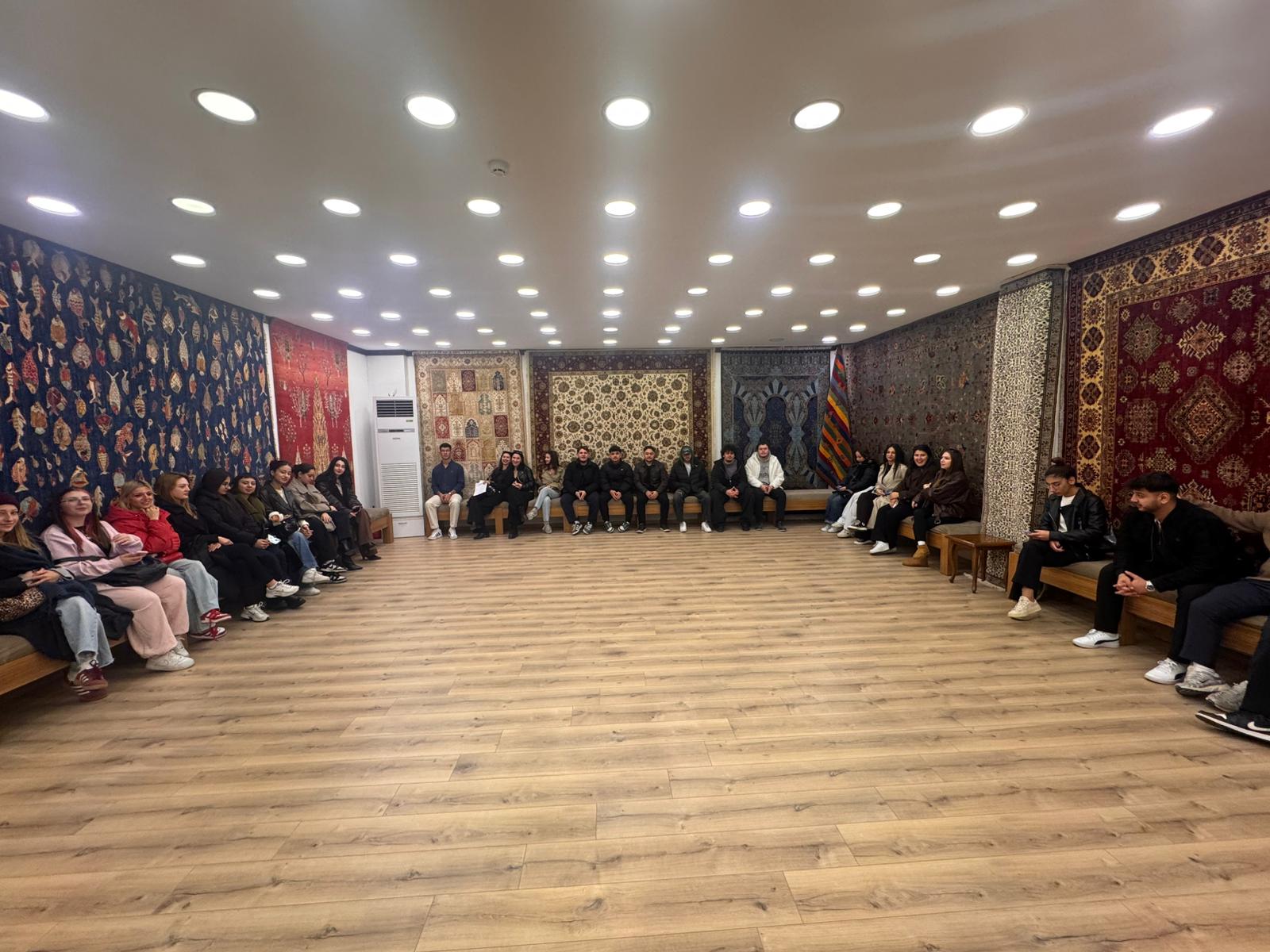 Seyahat İşletmeciliÄŸi Bölümü öÄŸrencileriyle gerçekleÅŸtirilen saha ziyareti kapsamında halı ve deri perakendeciliÄŸine yönelik iÅŸletmeler ziyaret edildi. İlk olarak Harem Halı MaÄŸazası’nda halı üretim süreci iplik aÅŸamasından dokumaya kadar uygulamalı olarak tanıtıldı; ürün sunumu ve satış yaklaşımları hakkında bilgilendirme yapıldı.