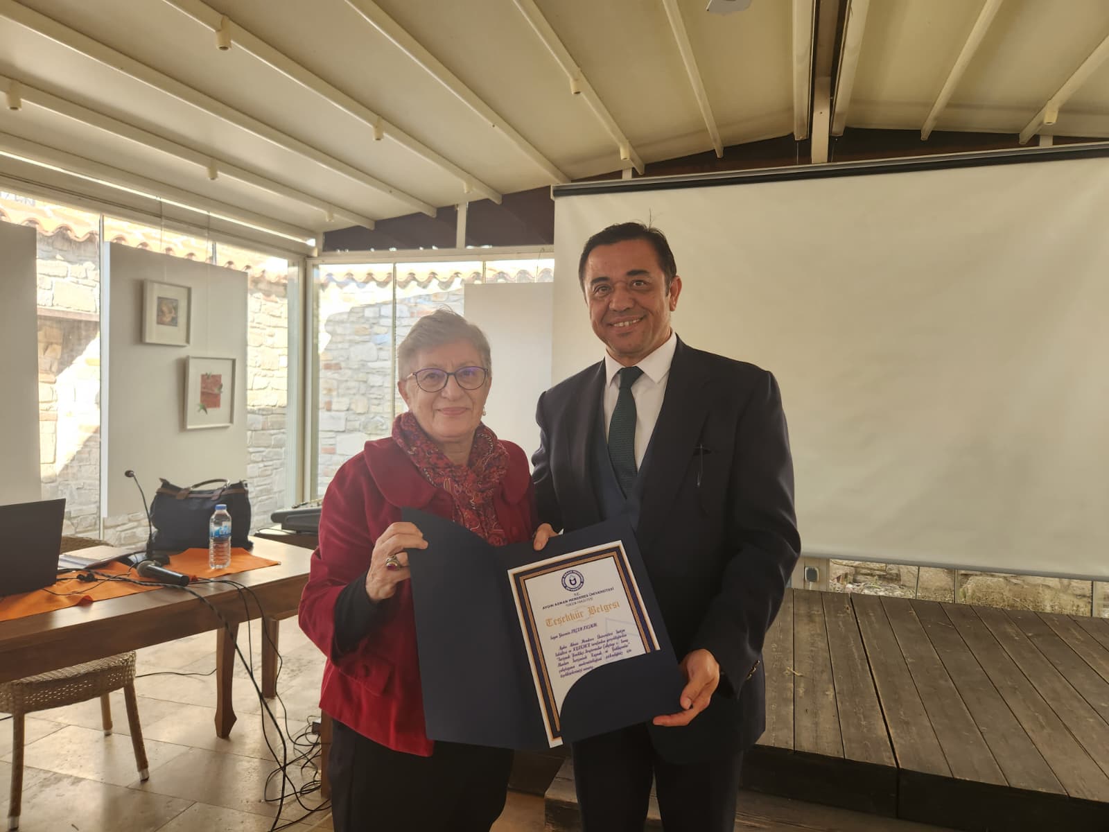 Turizm Fakültemiz ile Kuşadası F.Özel Arabul Kültür Merkezi ve Kent Müzesi (KUAKMER) ortaklığında “Turizmde Yenilikçi Araştırmalar Çalıştayı 1: Savaş Alanları Turizminde Kaynak ve Yaklaşımlar”, 8 Nisan 2026 Çarşamba günü saat 16.00’da gerçekleştirildi. Katılımcılara belgelerini Fakültemiz Dekan Yardımcısı Doç.Dr. Hakan Atay ve Turizm Rehberliği Bölüm Başkanı Prof.Dr. Abdullah Tanrısevdi takdim etti.