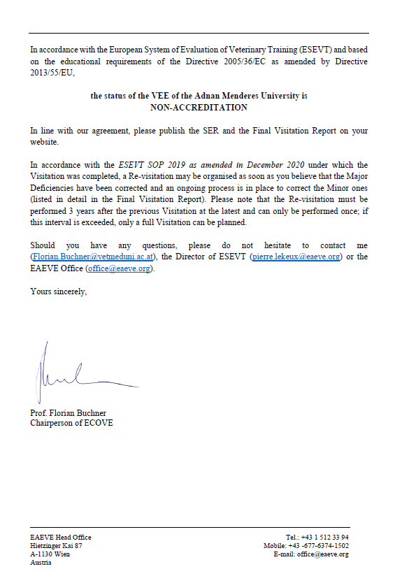 Administration of Aydın Adnan Menderes University Faculty of Veterinary Medicine and Faculty Members focused on the deficiencies described in the report, made the necessary arrangements to eliminate the deficiencies identified in the first visit, both in the laboratories and the experimental animals unit and the Research and Practice Hospital, and requested the second visit from EAEVE. EAEVE made this visit on March 22-24, 2015 and stated that the deficiencies identified in the first visit were largely eliminated. Based on the progress reports sent in November 2015 and April 2016, our faculty was certified in the APPROVAL category by ECOVE at the meeting held in Uppsala (Sweden) on May 11, 2016.