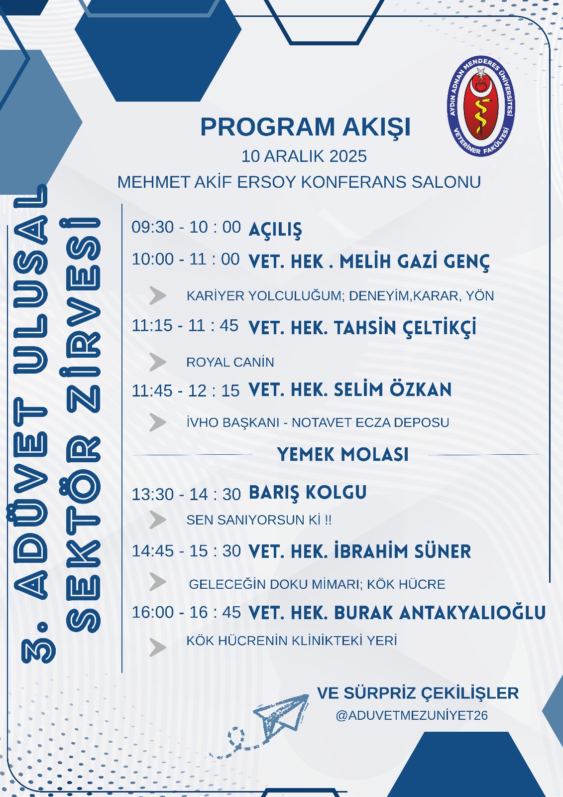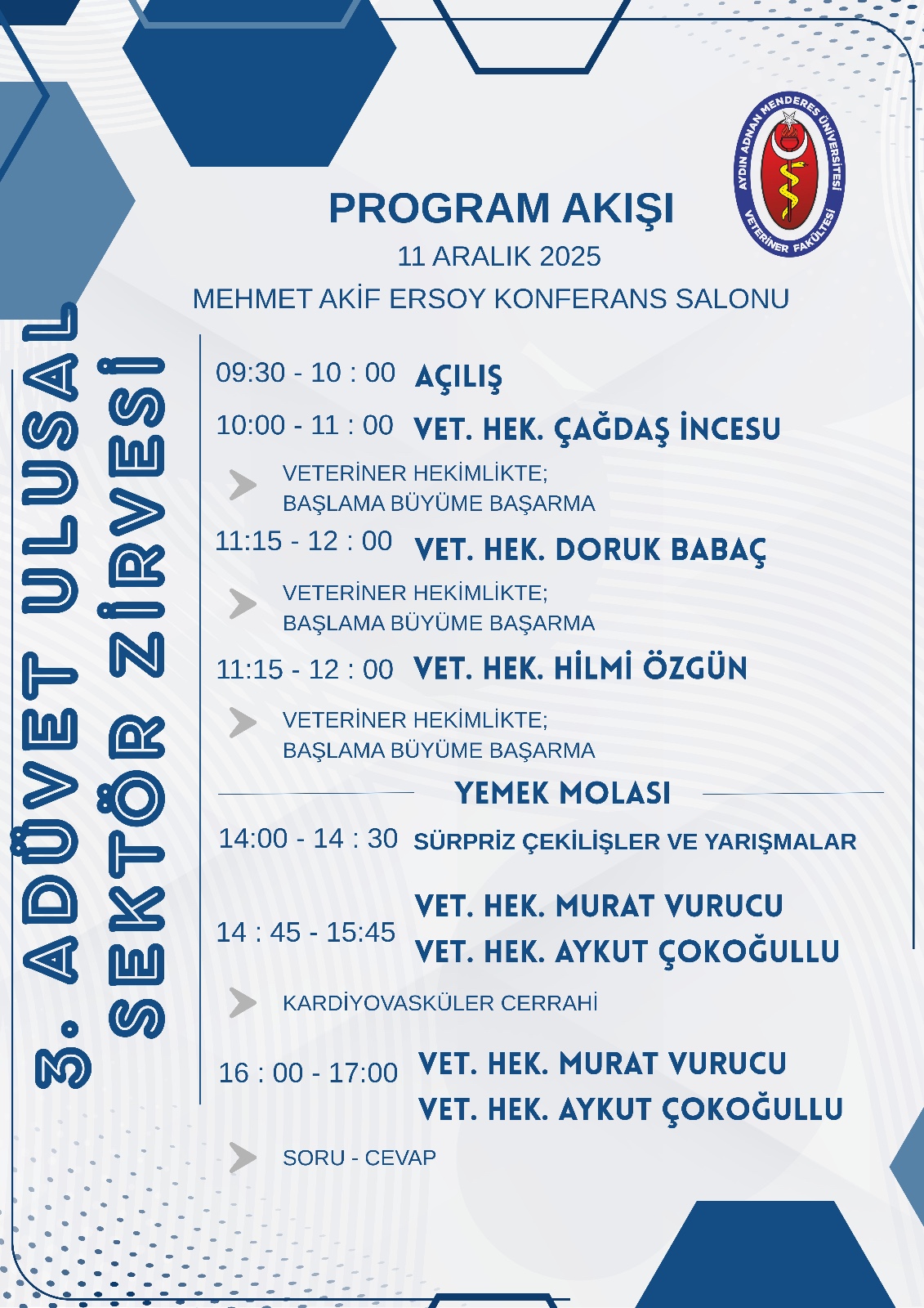Aydın Adnan Menderes Üniversitesi Veteriner Fakültesi tarafından düzenlenen 3. Ulusal ADÜVET Sektör Zirvesi, 10–11 Aralık 2025 tarihlerinde Mehmet Akif Ersoy Konferans Salonu’nda gerçekleştirildi.