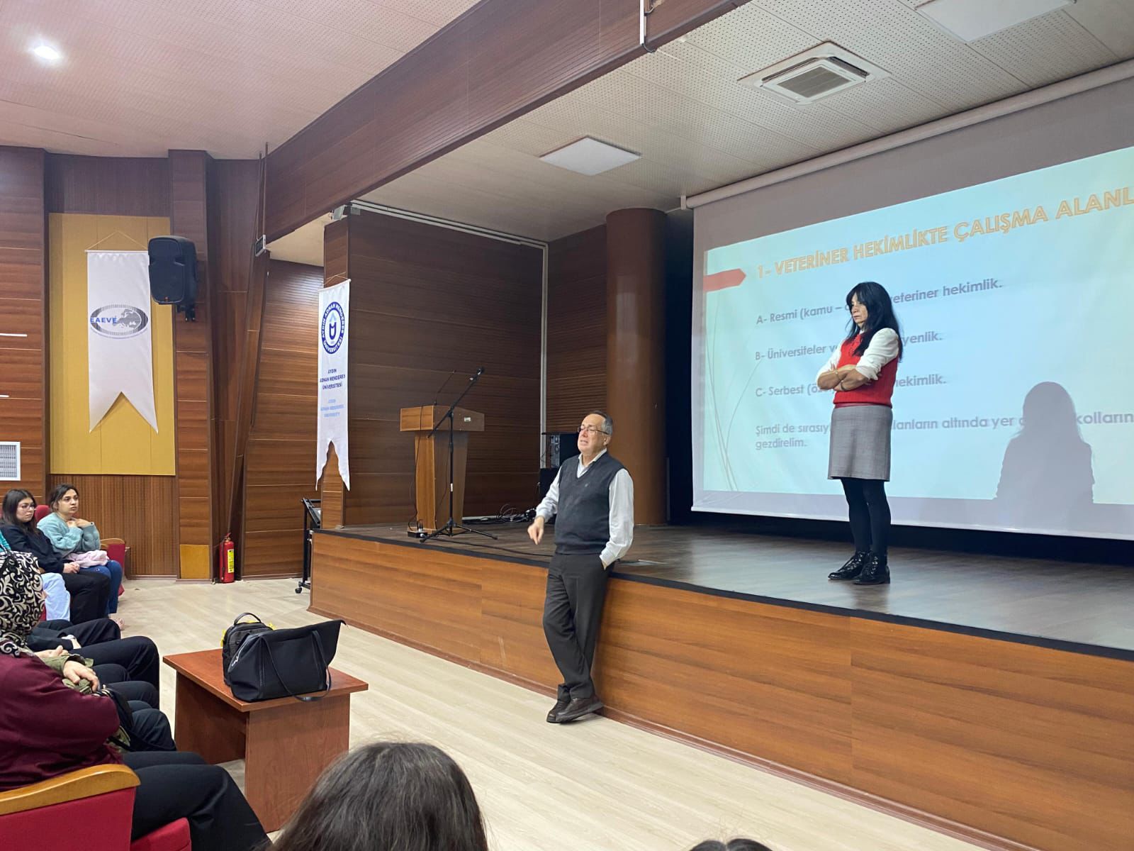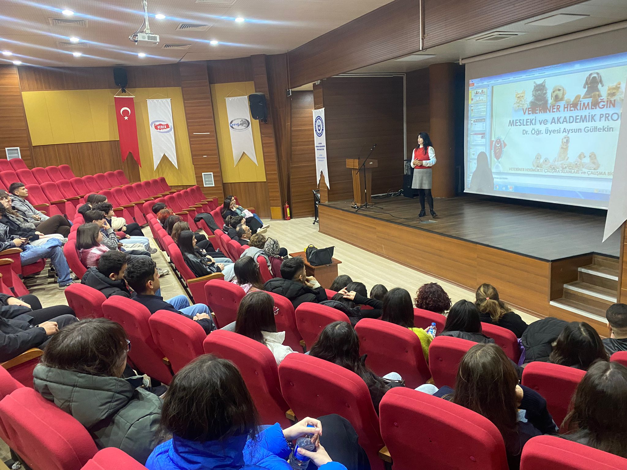 Programın devamında Mehmet Akif Ersoy Konferans Salonunda Veteriner Fakültesi Dekan V. Prof. Dr. Cavit Kum ve Dr. Öğr. Üyesi Aysun Gültekin, öğrencilerle bir araya gelerek fakültenin eğitim-öğretim faaliyetleri hakkında bilgi verip, sahip olduğu uluslararası (EAEVE) ve ulusal (VEDEK) akreditasyonlarının önemini vurguladı. Ayrıca veteriner hekimliğin hayvan, toplum, gıda ve çevre sağlığı açısından önemi ile mesleğin çalışma alanları hakkında açıklamalarda bulundu.