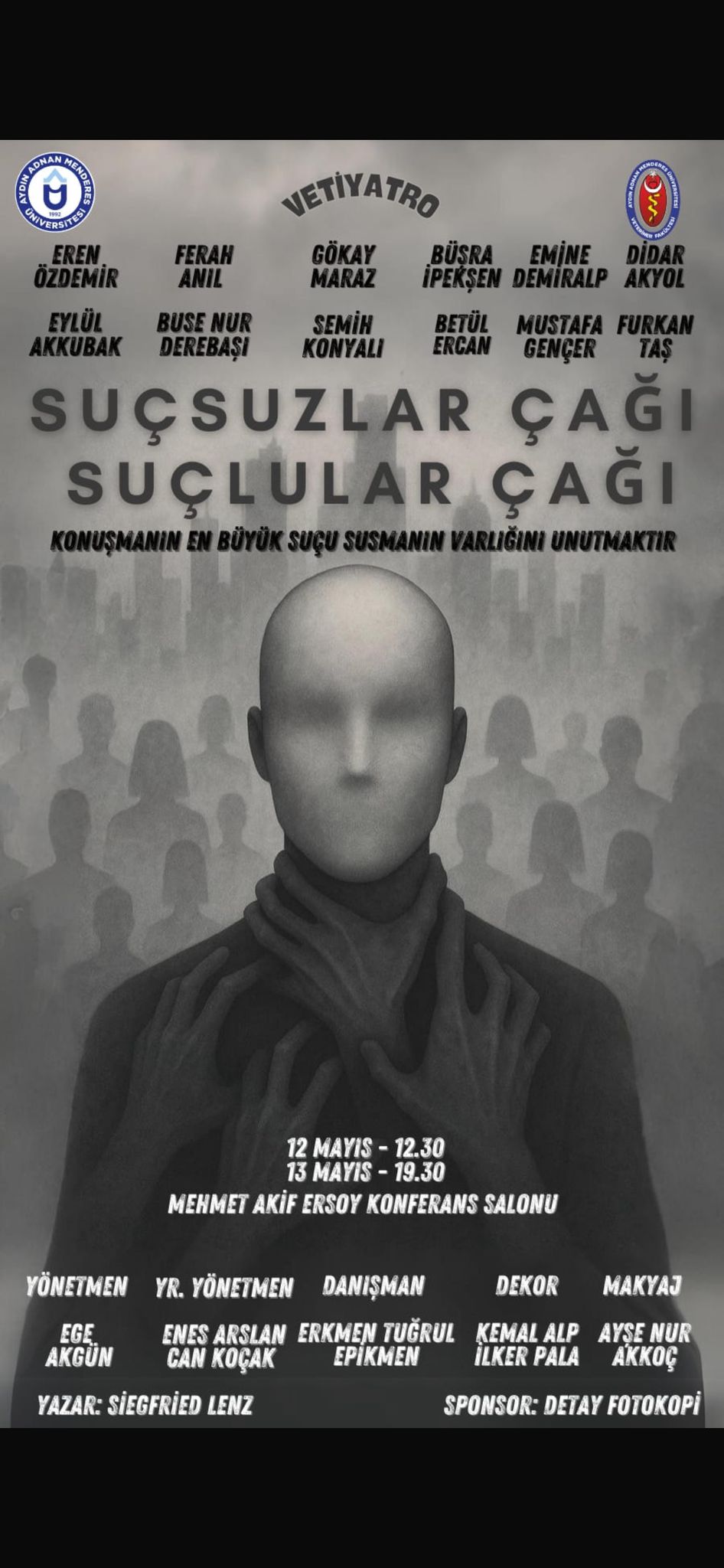 Alman yazar yazar Siegfried Lenz'e ait, suçun herkese bulaşarak anonimleşmesi, suç kavramının keyfileşmesi üzerine metaforik bir oyun olan bu eseri canlandıran öğrenciler, oyunun hem yönetmenliğini hem oyunculuğunu hem de sahne arkası emeğini üstlendiler. Etkinlik, başarılı performansları ile tam not alan öğrencilerimize teşekkür edilmesi ve tebriklerin kabulü ile son buldu.