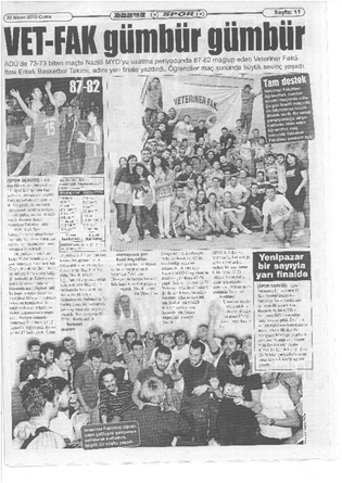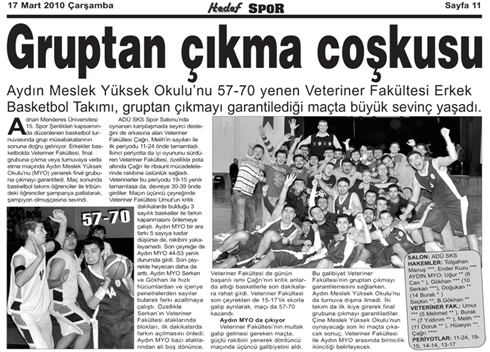 Adnan Menderes Üniversitesi Sağlık Kültür ve Spor Dairesi Başkanlığı tarafından düzenlenen 16. Spor Şenlikleri hazırlıkları kapsamında Fakültemiz Bayanlar Basketbol Takımı (Merve Güdek, Merve Diyarlar, Firuze Türker, Ezgi E. Şamiloğlu, Songül Toplu, F. Canset Özden, M. Kübra Ülger, Gizem Battal) turnuva kapsamında 3. olmuştur.