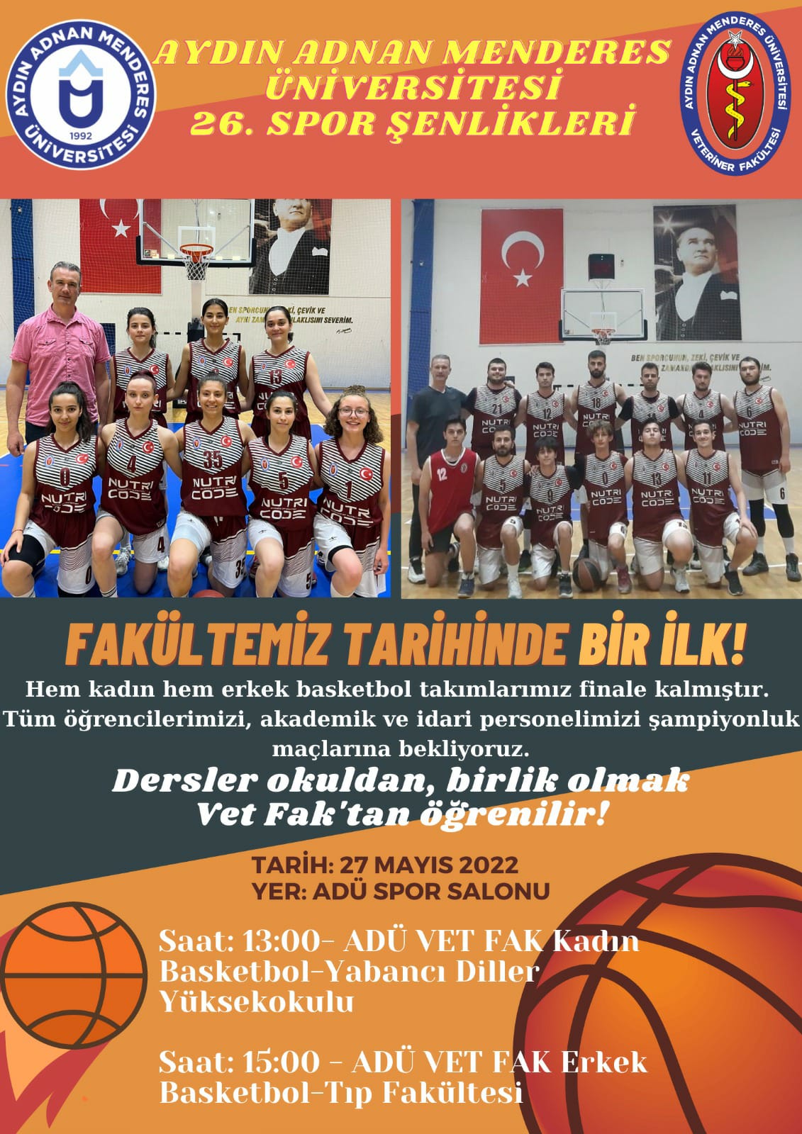 Aydın Adnan Menderes Üniversitesi Sağlık Kültür ve Spor Dairesi Başkanlığı tarafından düzenlenen 26. Spor Etkinlikleri Turnuvalarında Fakültemiz Kadın ve Erkek Basketbol Takımları şampiyon olmuşlardır. Bizleri gururlandıran öğrencilerimizi tebrik ediyoruz.