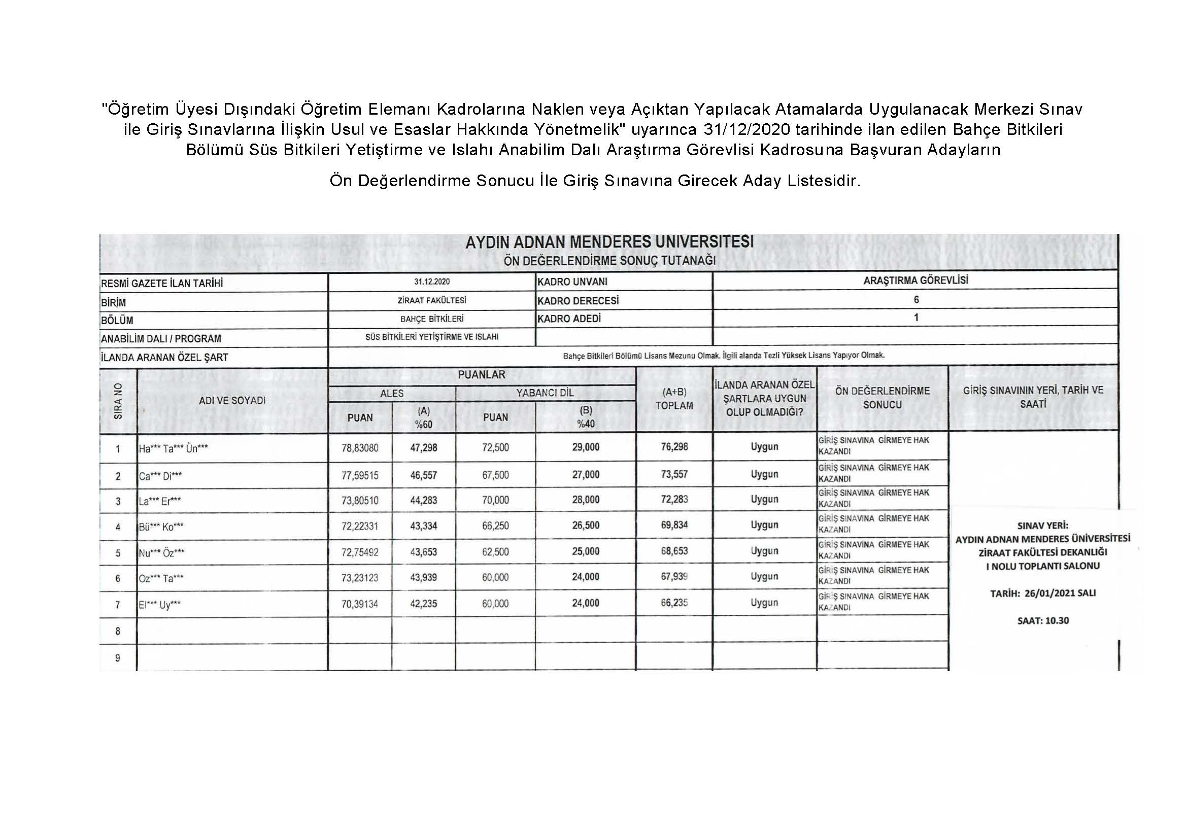 Araştırma Görevlisi Ön Değerlendirme Sonuçları