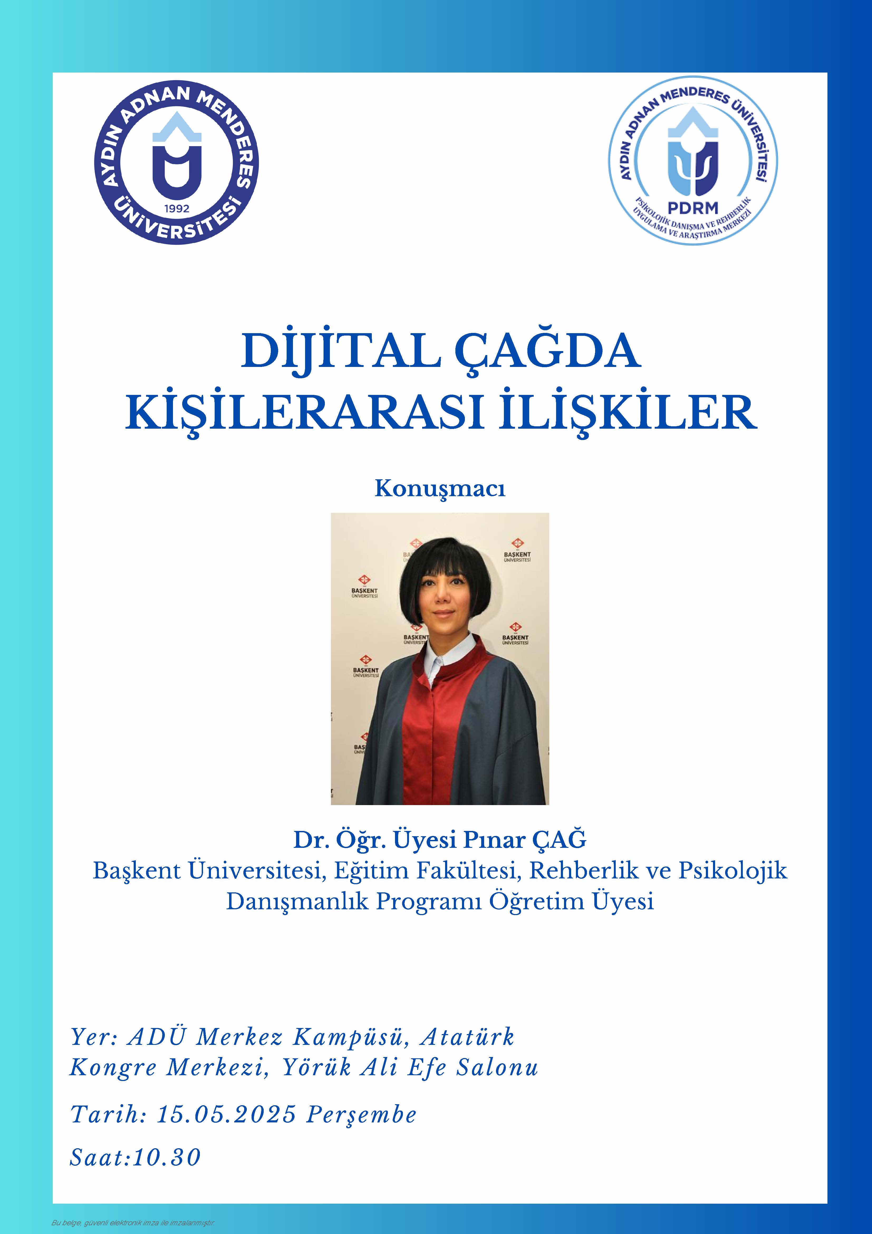 Dr. Öğr. Üyesi Pınar ÇAĞ (Başkent Üniversitesi, Eğitim Fakültesi, Rehberlik ve Psikolojik Danışmanlık Programı Öğretim Üyesi ) taafından "DİJİTAL ÇAĞDA KİŞİLERARASI İLİŞKİLER" konulu seminer 15 Mayıs 2025 Perşembe günü 10:30'da ADÜ Merkez Kampüsü, Atatürk Kongre Merkezi, Yörük Ali Efe Salonu'nda gerçekleştirilecektir.