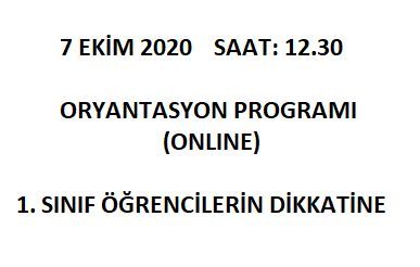 1. sınıf öğrencilerimize 7 Ekim 2020 Çarşamba günü saat 12:30 da uzaktan online oryantasyon programı yapılacaktır.