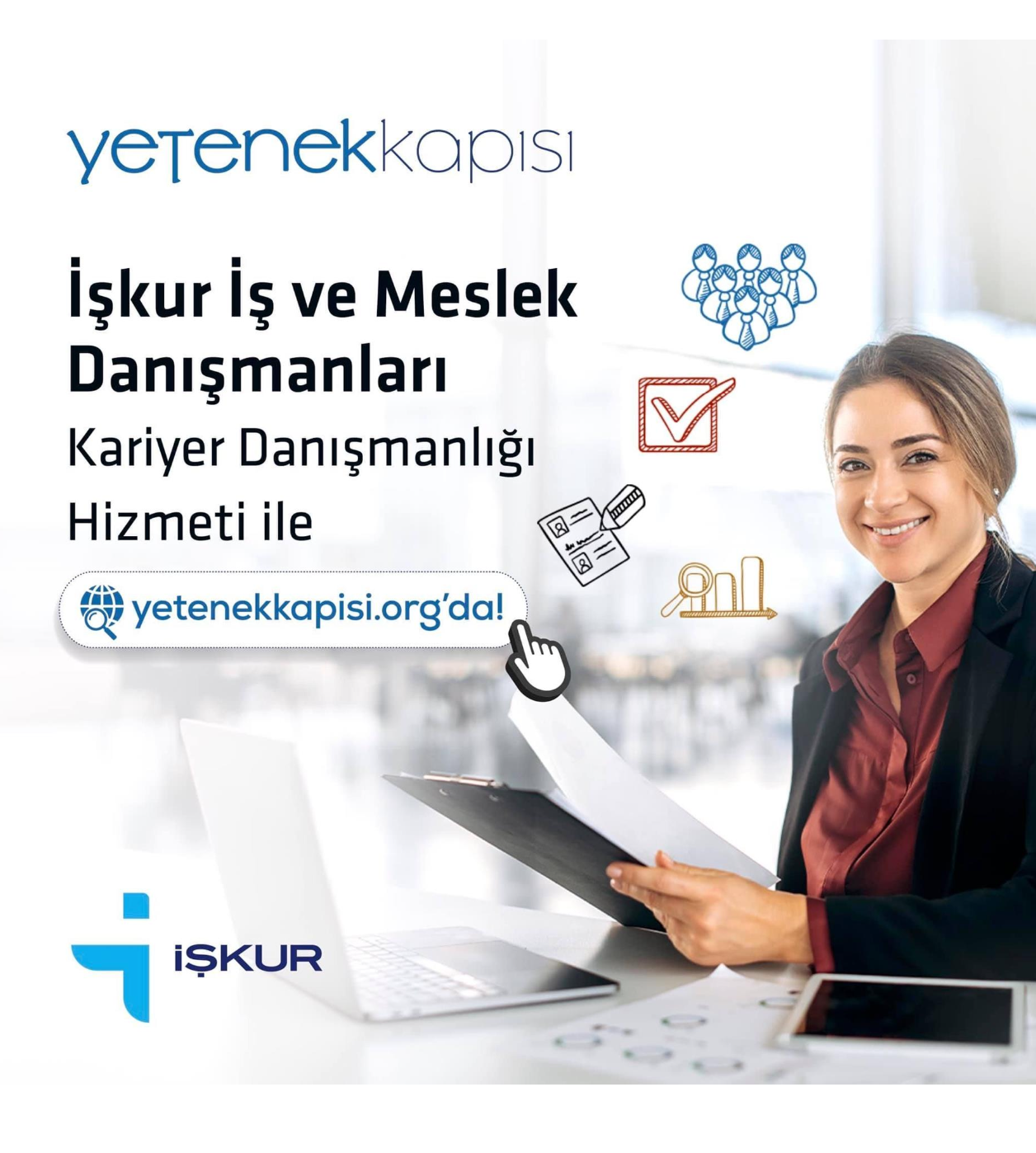 Cumhurbaşkanlığı İnsan Kaynakları Ofisi tarafından, Üniversitemiz öğrenci/mezunlarımızın kariyer gelişimlerini desteklemek ve kariyer danışmanlığı hizmetlerinin erişilebilirliğini artırmak üzere, İŞKUR kadrosunda görev yapan üç İş ve Meslek Danışmanı Yetenek Kapısı Platformu' na Üniversitemiz adına kariyer danışmanları olarak tanımlanmıştır. Kariyer Danışmanlığı için öğrencilerimiz Yetenek Kapısı Platformu üzerindeki, Kariyer Danışmanlığı sekmesinden çevrimiçi veya yüz yüze olarak randevu talebi yapabilmektedir.