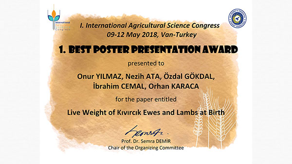 09-12 Mayıs 2018 tarihinde Van Yüzüncü Yıl Üniversitesi ev sahipliğinde gerçekleştirilen “International Agricultural Science Congress” kapsamında Üniversitemiz Öğretim Elemanları Dr. Onur Yılmaz, Araş. Gör. Nezih Ata, Prof. Dr. Özdal Gökdal, Prof. Dr. İbrahim Cemal ve Prof. Dr. Orhan Karaca tarafından hazırlanan “Live weight of Kıvırcık ewes and lambs at birth” isimli poster bildiri 715 poster bildiri arasından en iyi poster ödülüne layık görülmüştür.