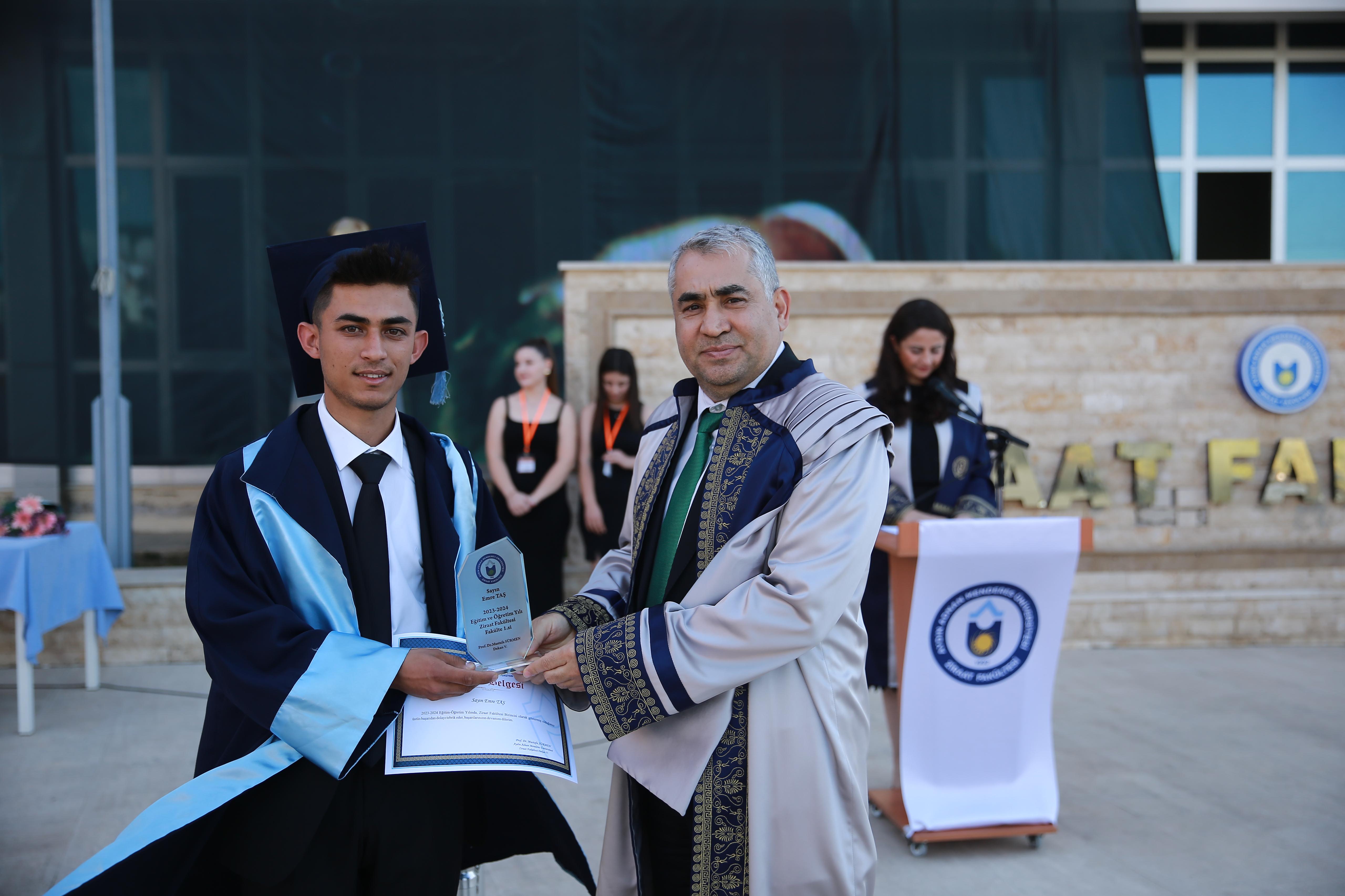 2023-2024 Akademik yılı fakülte birincisi Emre Taş’ın yaş kütüğüne plaketini çakmasının ardından Üniversitemiz Rektörü Prof. Dr. Bülent Kent tarafından kendisine başarı plaketi verildi. Bölümde dereceye giren ve mezun olan tüm öğrencilere protokol üyeleri tarafından başarı belgeleri verildi.