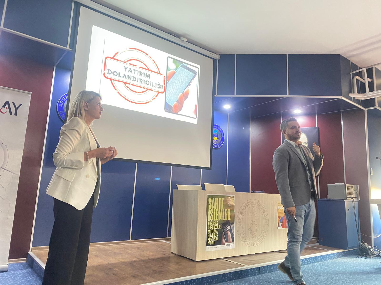 ÖÄŸr. Gör. Zühal MollaoÄŸulları, Aydın Emniyet MüdürlüÄŸü Siber Suçlarla Mücadele Åžube MüdürlüÄŸü Siber Güvenlik Uzmanı polis memuru UÄŸur Bulut ve komiser yardımcısı Günay Keman’ın konuÅŸmacı olarak yer aldığı eÄŸitimde; “Siber Suç”, “BiliÅŸim Sistemlerinin Kullanımı”, “Nitelikli Dolandırıcılık”, “Online AlışveriÅŸ”, “Yasa Dışı Bahis” ve “İnternet Kullanımında Temel Güvenlik Önlemleri” hakkında bilgi verildi.