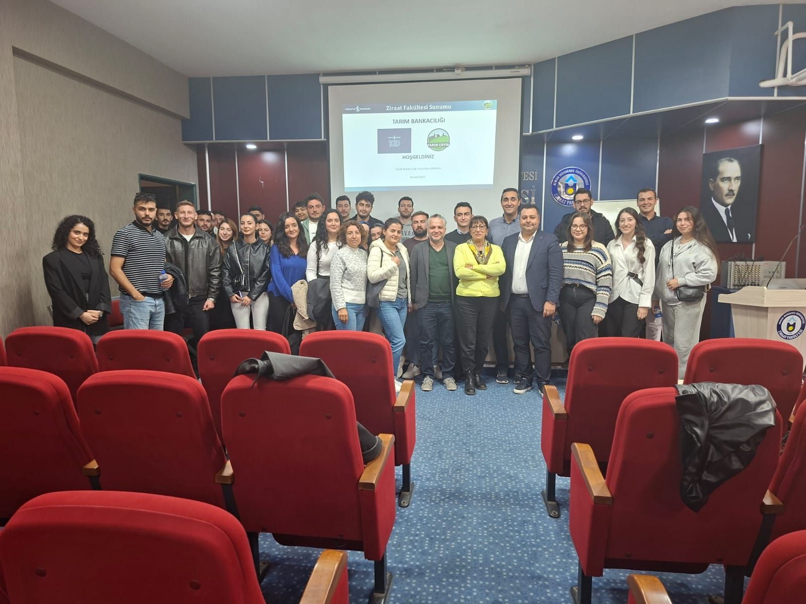 Ziyaret kapsamında İş Bankası Tarım Bankacılığı Bölümü’nde görevli Ziraat Yüksek Mühendisleri, Mustafa Alper Devran ve Ahmet Nazmi Durgut, Tarom Politikası ders sorumlusu Prof. Dr. Renan Tunalıoğlu moderatörlüğünde öğrencilere yönelik kapsamlı bir tarım bankacılığı eğitim sunumu gerçekleştirdiler. Sunumda; Türkiye'de tarımın ekonomik konumu, tarımsal işletmelerin finansman süreçleri, tarım kredilerinin yapısı, sürdürülebilir tarım yatırımlarının bankacılık açısından değerlendirilmesi ve üreticiye yönelik finansal destek mekanizmaları gibi geniş bir yelpazede bilgiler aktarıldı. Ayrıca, bankanın tarım sektörüne özel geliştirdiği ürün ve hizmetlere dair detaylı bilgilendirmeler yapıldı.
