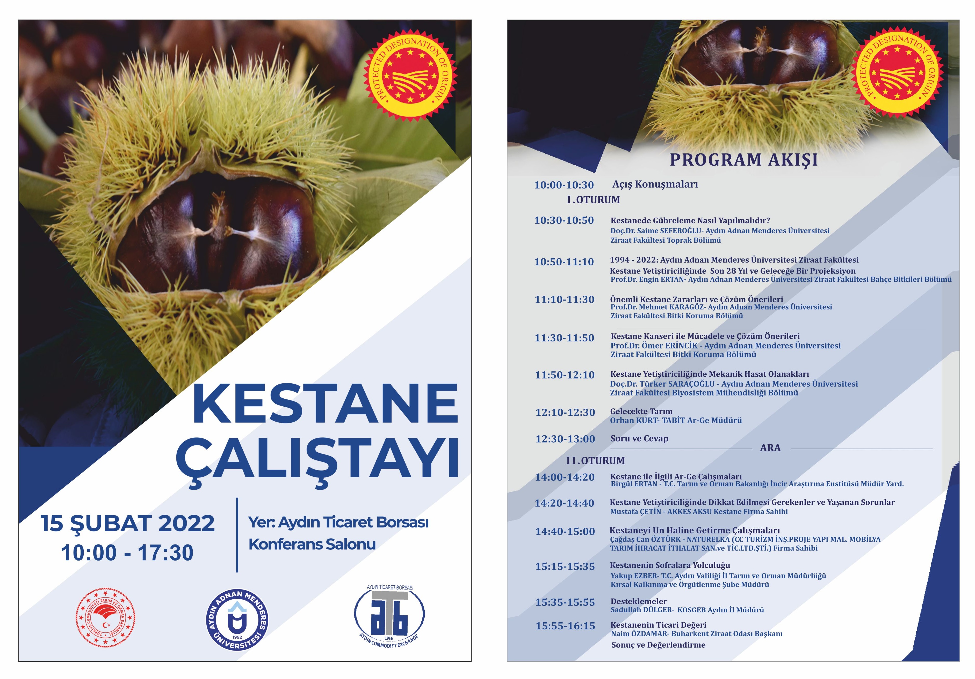 Aydın Ticaret Borsası ev sahipliÄŸinde Aydın Adnan Menderes Üniversitesi Ziraat Fakültesi, T.C. Tarım ve Orman Bakanlığı Aydın İncir AraÅŸtırma Enstitüsü MüdürlüÄŸü iÅŸbirliÄŸi ve Küçük ve Orta Ölçekli İşletmeleri GeliÅŸtirme ve Destekleme İdaresi BaÅŸkanlığı Aydın İl MüdürlüÄŸü'nün desteÄŸiyle 15 Åžubat 2022 Salı günü Kestane Çalıştayı düzenlenecektir. Aydın Ticaret Borsası Konferans Salonu'nda 10.00-17.30 saatleri arasında gerçekleÅŸtirilecek olan Kestane Çalıştayı'nda; Ziraat Fakültesi Dekanı Prof.Dr. İbrahim Gençsoylu ve GEKA Aydın İl koordinatörü Numan Katıksız’ın ModeratörlÄŸü’nde yapacağı kestane yetiÅŸtiriciliÄŸinde yaÅŸanan sorunlar ve çözüm Önerileri, kestanenin ticari deÄŸeri, desteklemeler, ihracat gibi konular anlatılacak olup, çalıştay sonunda katılımcıların soruları cevaplandırılacaktır.