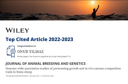 Fakültemiz Zootekni Bölümü Biyometri ve Genetik Ana Bilim Dalı ÖÄŸretim Üyesi Doç. Dr. Onur Yılmaz tarafından Journal of Animal Breeding and Genetics isimli dergide yayımlanan “GenomeR08;Wide Association Studies Of Preweaning Growth and In Vivo Carcass Composition Traits In Esme Sheep” isimli makale en çok atıf alan 10 içinde yer aldı.