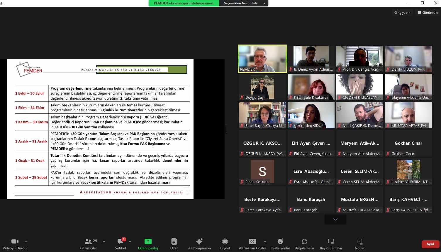 Peyzaj Mimarlığı EÄŸitim Programları Akreditasyon Kurulu (PAK) tarafından 15 Kasım 2024 tarihinde çevrim içi düzenlenen Akreditasyon Bilgilendirme Toplantısı’na, Fakültemiz Peyzaj Mimarlığı Bölümü katılım saÄŸladı.