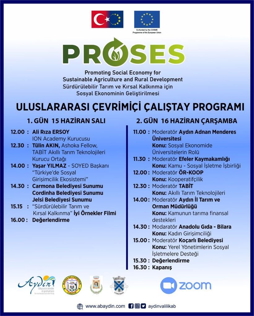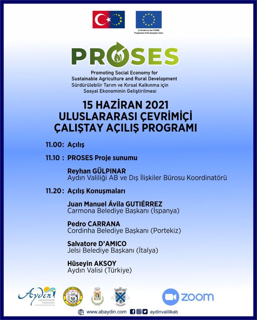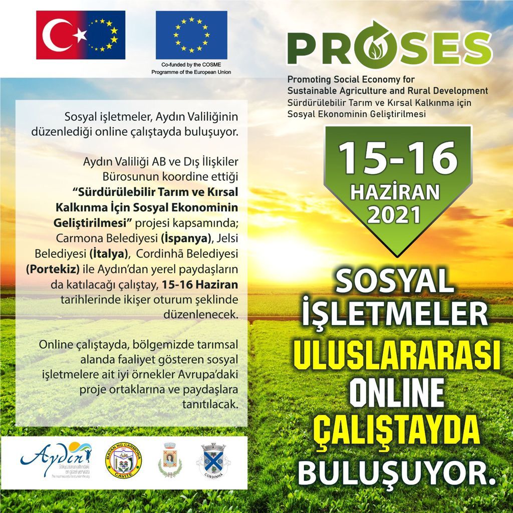 ydın ValiliÄŸinin liderliÄŸinde, Sürdürülebilir Tarım ve Kırsal Kalkınma alanında iÅŸbirliÄŸi için İspanya, İtalya ve Portekiz'den ortak belediyeler ile yürütülen "Promoting Sustainable Agriculture and Rural Development" PROSES projemizin ilk uluslararası çalıştayını pandemiden dolayı çevirimiçi olarak gerçekleÅŸtiriyoruz.