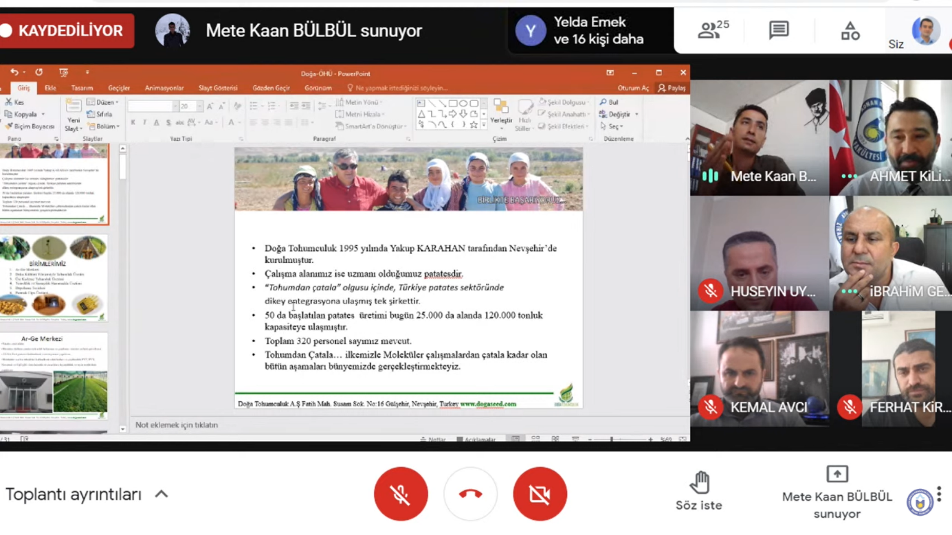 Aydın Adnan Menderes Üniversitesi Ziraat Fakültesi Dekanlığı tarafından 26.05.2021 Çarşamba günü Ziraat Fakültesi öğrencilerine yönelik olarak düzenlenen “Sektörle Buluşma” teması altında “Stajdan, Genel Müdürlüğe” söyleşisi çevrimiçi olarak gerçekleştirildi. Etkinlikte Doğa Tohumculuk Gıda San. Tic. A.Ş. Genel Müdürü Sayın Mete Kaan BÜLBÜL konuk edildi. Youtube üzerinden canlı olarak yayınlanan etkinlikte Ziraat Fakültesi Öğretim Elemanlarının ve öğrencilerinin yoğun ilgisi görüldü. Sayın Mete Kaan BÜLBÜL konuşmasında, kendi meslek hayatı boyunca edindiği tecrübeleri paylaştıktan sonra özellikle genç Ziraat Mühendisi adayı öğrenicilerimize kendi öğrencilik yıllarından itibaren genel müdürlüğe kadar geçen çalışma sürecindeki aşamaları anlattı. Özellikle Lisans eğitimi sürecinde hiçbir maddi beklentisi olmadan birden çok firmada staj yaptığını ve en son staj yaptığı firmaya Ziraat Mühendisi olarak göreve başladıktan sonra Genel Müdürlüğe kadar yükseldiğini örnek başarı profili olarak paylaştı. Bu anlamda öğrencilik süresi içerisinde yapılan stajların meslek hayatları için önemini vurguladı. Etkinlik, öğrencilerden gelen yoğun sorulara Sayın Mete Kaan BÜLBÜL’ün verdiği cevaplarla sürdürüldü. Söyleşi, Ziraat Fakültesi Dekan V. Prof. Dr. İbrahim GENÇSOYLU’nun teşekkür konuşmasıyla sonlandırıldı.